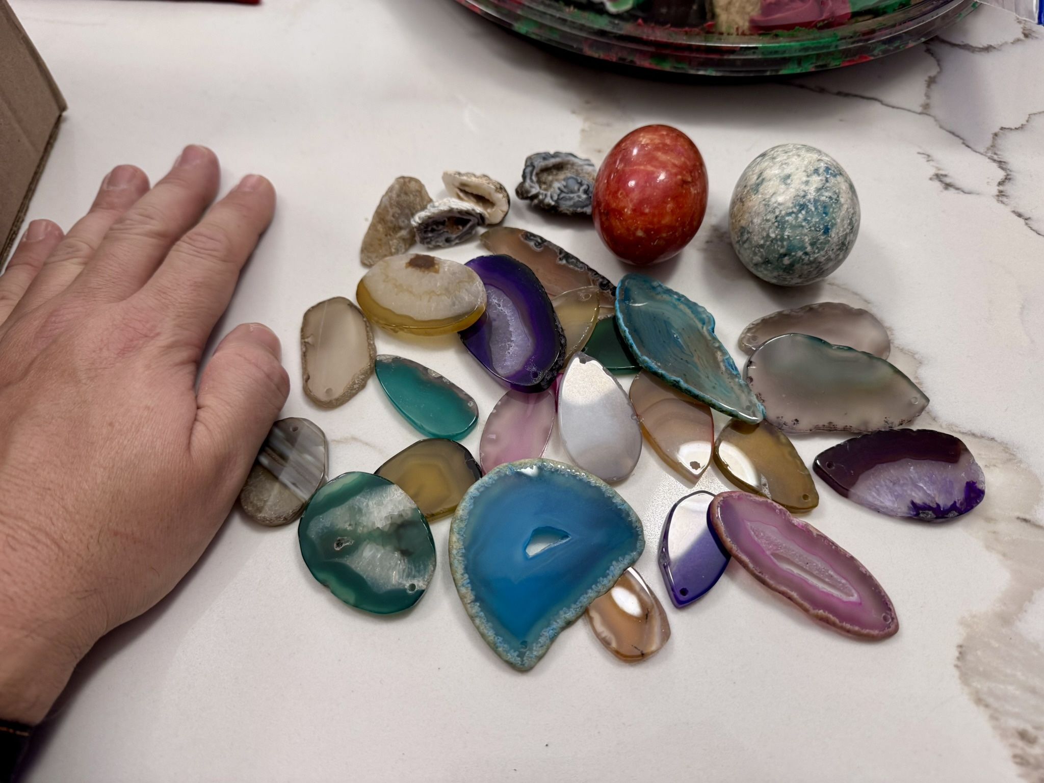 Huge assortment of tumbled and polished gemstones, agates, eggs, cabochons. Stone sizes range from small to medium with a few larger pieces present. Also included are some tiny geodes, small agate slices, a few eggs, and a tower. Some stones are loose and others are in the containers that they came in. Also including real wood hand crafted bowls for making little displays. Amazing value for crafters, collectors, lapidary fans, or rock hounds. At least 18 lbs of stones. Make some zen bowls for your home, office, or wherever you need a little good energy.