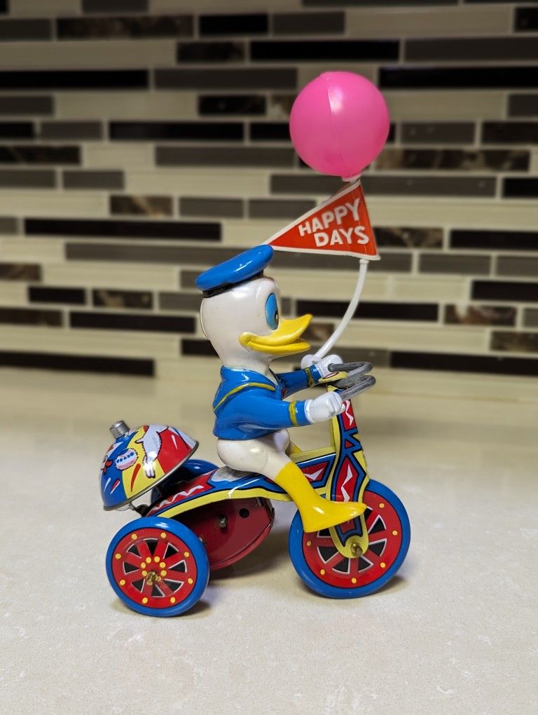 This vintage Donald Duck tricycle toy features a charming tin litho design and is in perfect working order, ready to be enjoyed by collectors and Disney fans alike. The toy comes with its original box, adding to its nostalgic appeal. Pick up only. $180 cash only. Serious inquiries please