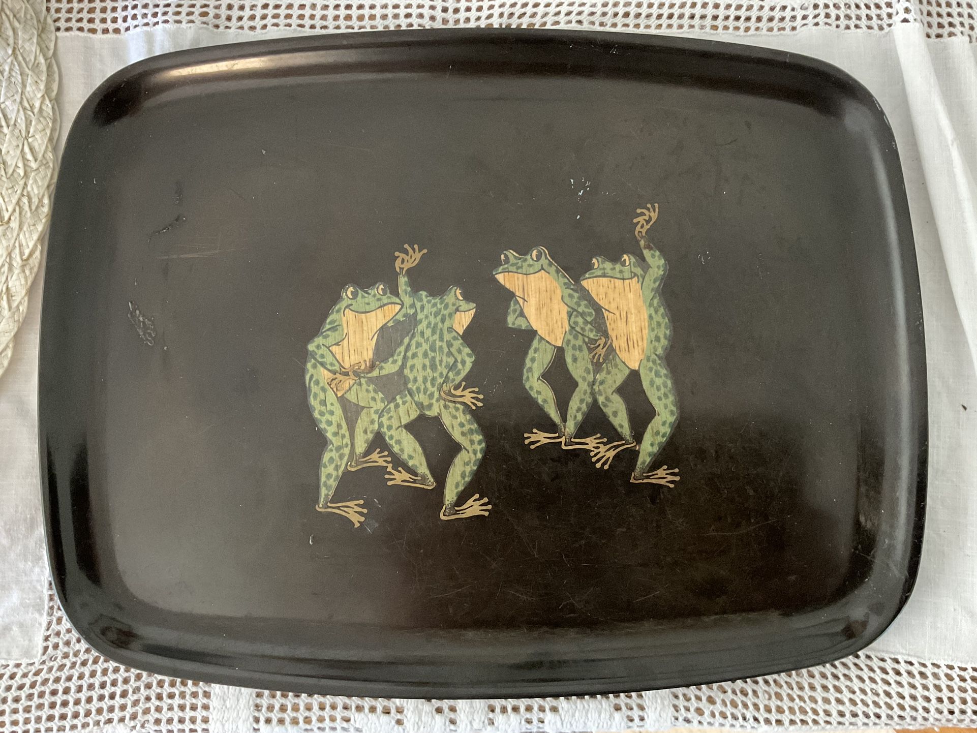 Offered in Jupiter fl 1960’s vintage cocktail tray/ etc. made by Couroc of Monterey CA. with dancing frogs . Great shape. Dimensions pictured. $20