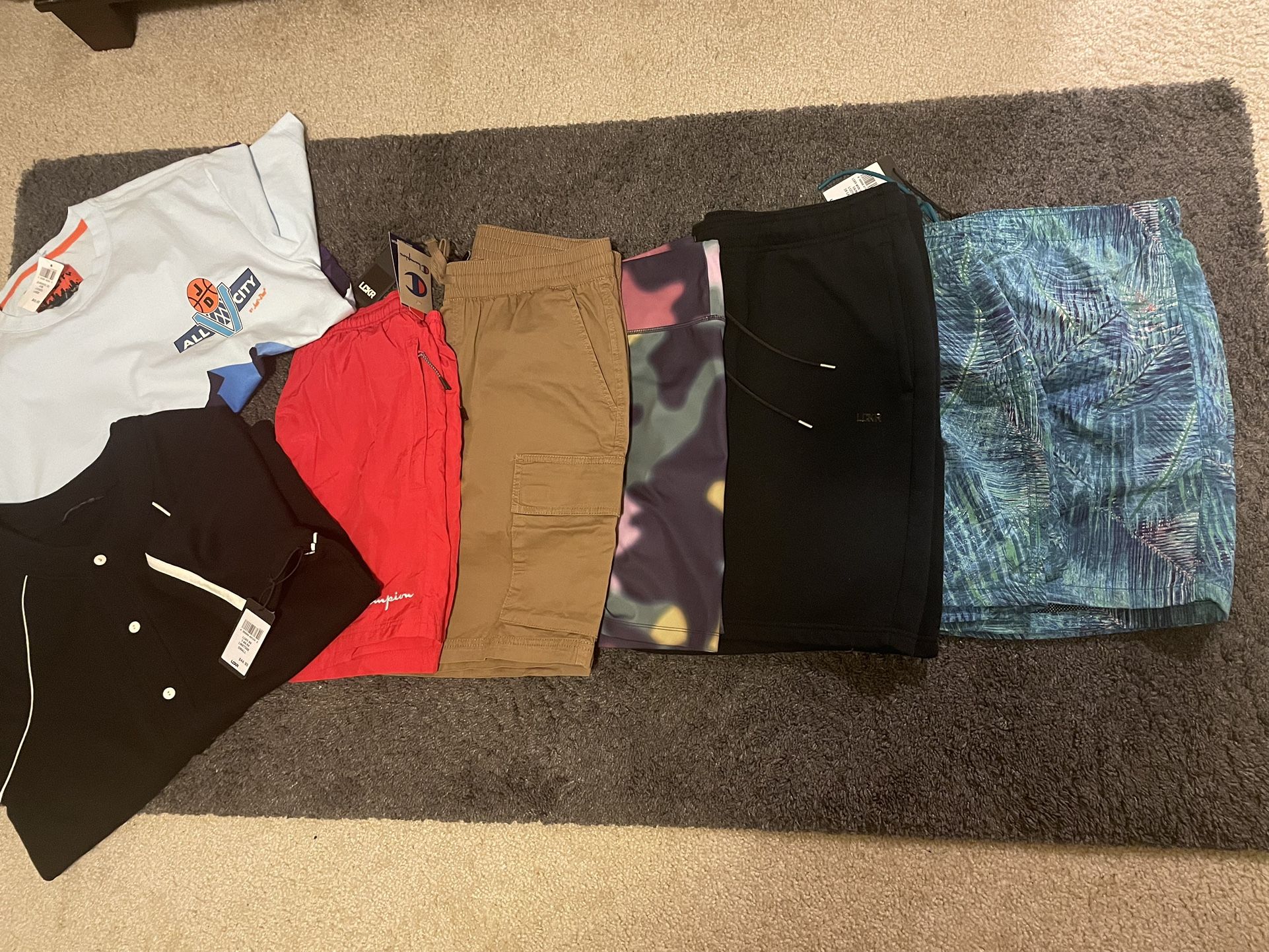 Brand new never used clothes Champion red shorts size small $10 Lckr black shorts size XXL $10 Lckr blue swimming shorts size small and XXL $10 each Lckr brown cargo shorts size large $10 Houseofhoops women shorts size large $10 Lckr button up shirt size small $15 All city shirt size large $10 If you take more than one we can agree on a deal