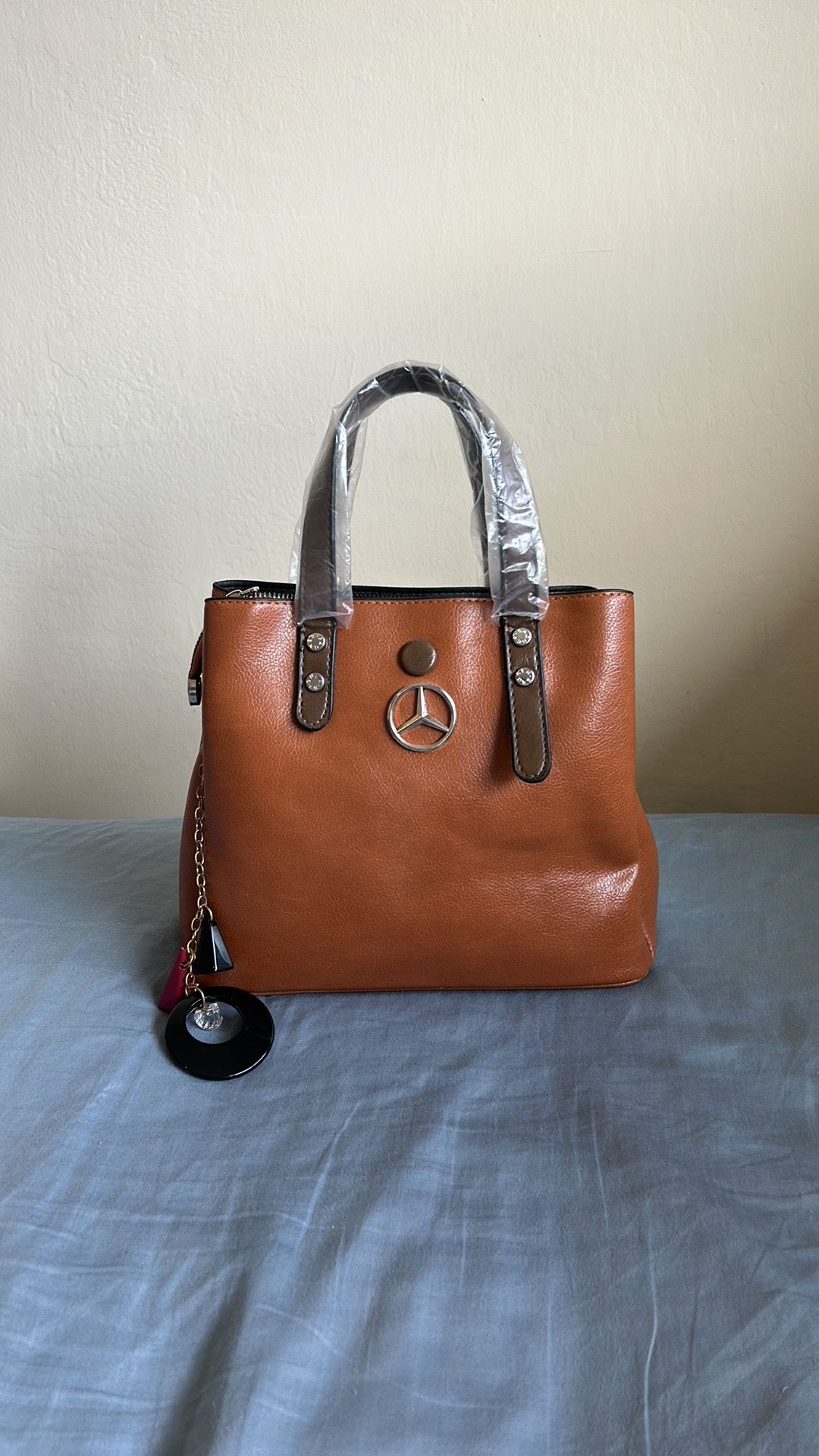 Limited-Edition Mercedes-Benz crossbody handbag in beautiful Cognac color This bag was hard to find on the Internet, but from what I discovered it was released in 2021-2022 and is not widely available. I received this as a gift and while it is overall a solid, functional handbag, it just not quite my style. Never been used, top handles still have protective plastic! That being said, there are small marks that appear to be paint or the like on the back, see photos. Also some creasing from storage. (This does not retract the beauty of the piece) Also, it’s important to note that while I was photographing and inspecting the bag, a stitch popped in the interior, please see photos for details. Also, metal chain on the charm has some tarnishing. Includes crossbody strap and charm, both removable, as pictured. Plenty of compartments, zip pockets, and magnetic button-closures! Approx dimensions are 10.2″ (26cm) L x4.7″ (11cm) W x13.8″ (35cm) H