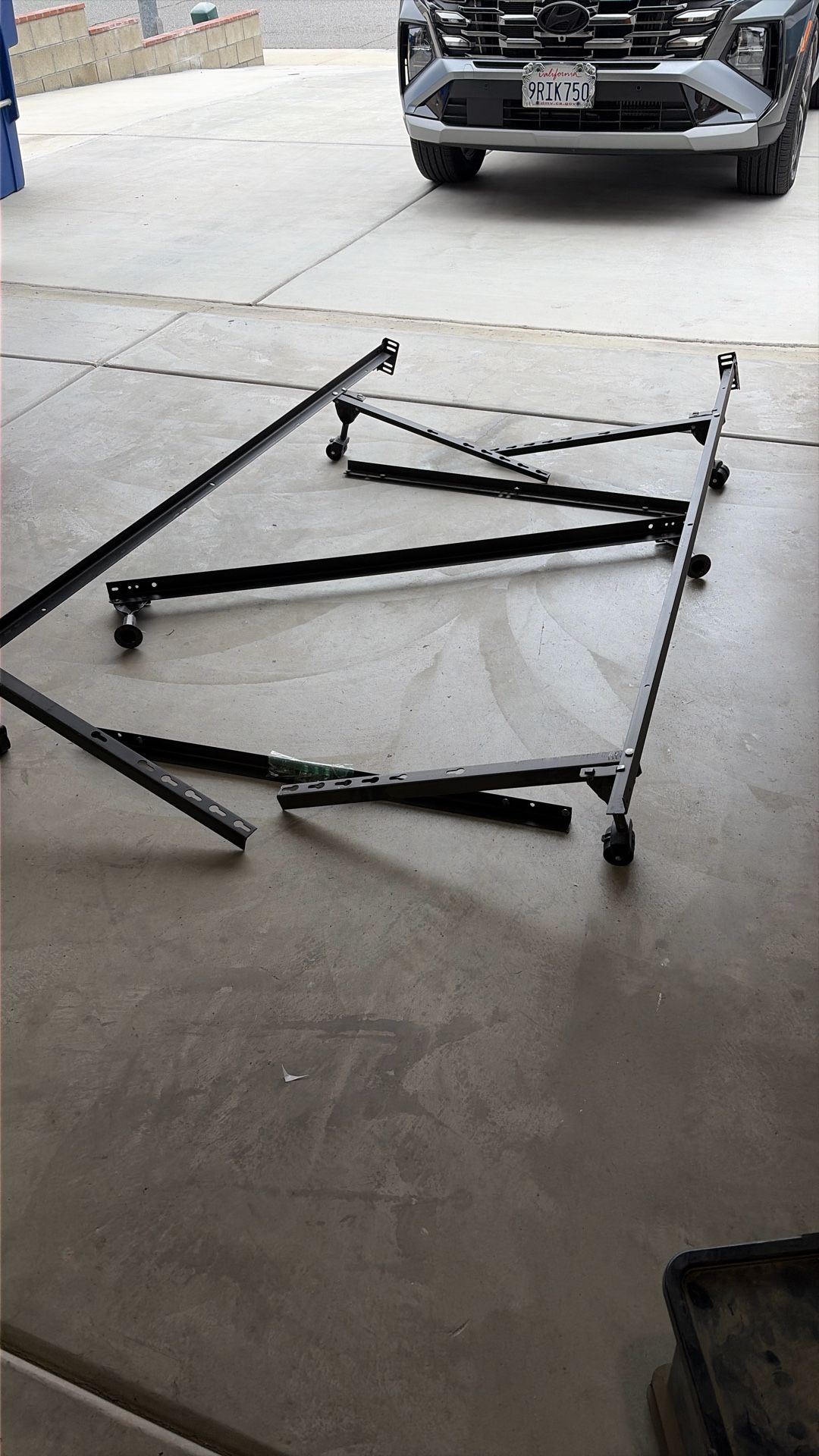Free bed frame with wheels and center support. Adjust to a double or queen and king bed.