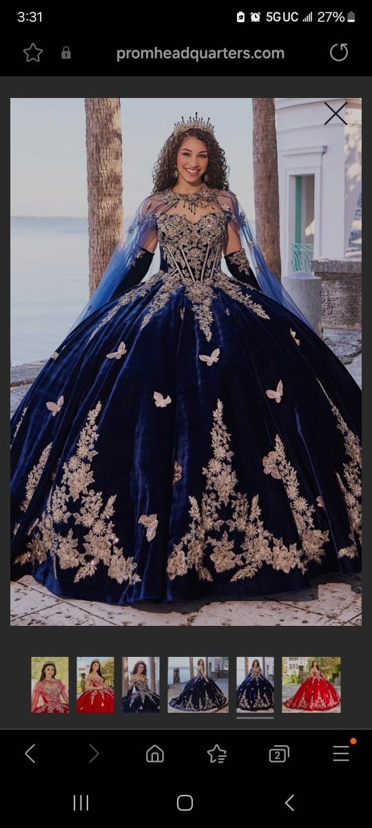 Xsmall - small Original PRINCESA BY ARIANA VARA QUINCEANERA DRESS Used for Few Hours Navy blue and Gold butterflies Velvet Comes with Cape and gloves
