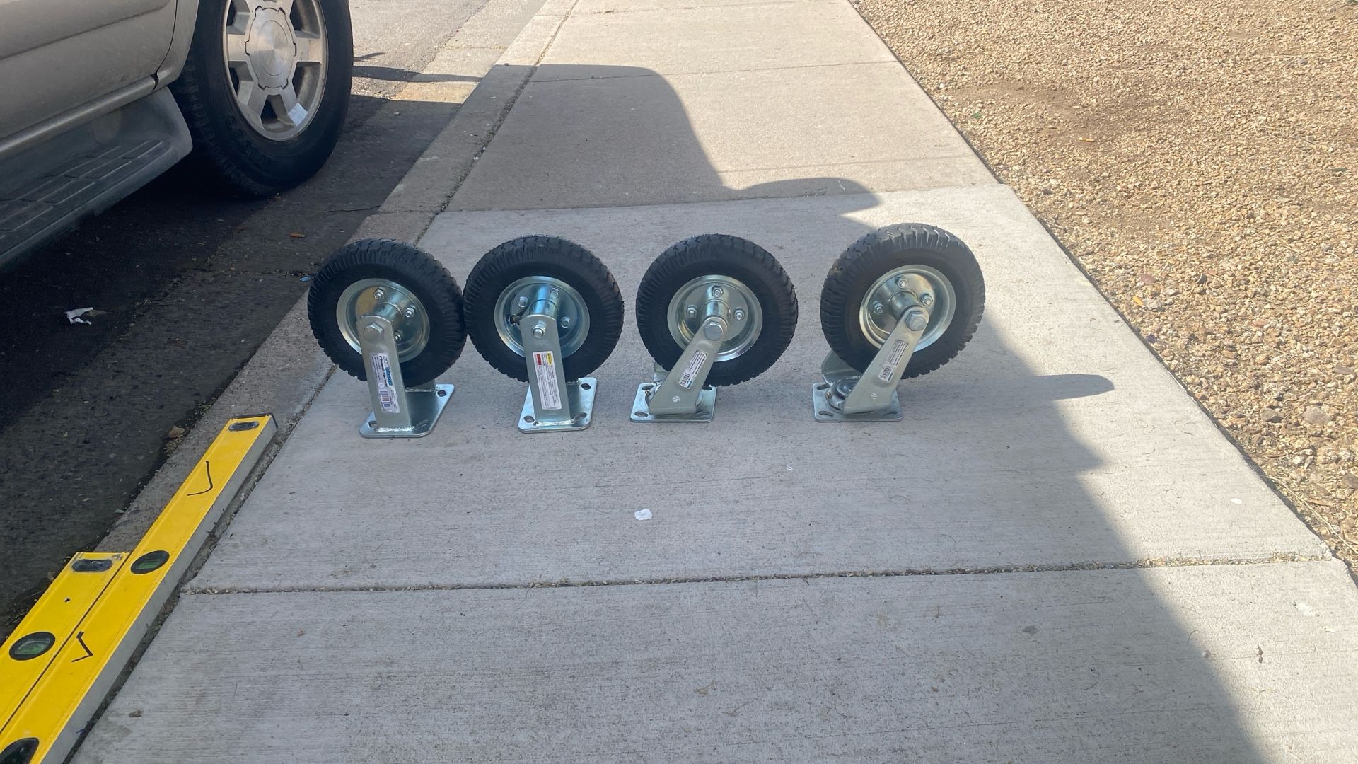 4 pneumatic 8” caster wheels from harbor freight.2 are fixed ,2 are swivel..New ,never used.cost 16.99 a piece…tires take air(pneumatic)..feel free to ask any questions..Thanks for looking!!!