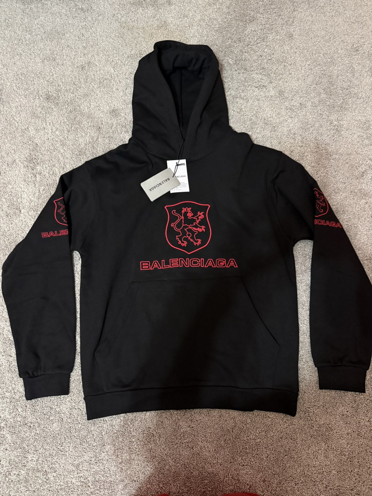 Brand new Balenciaga black hoodie in Medium, never worn and still has the original tags attached. Features a bold red crest logo on the front, red Balenciaga lettering on both sleeves, and matching back graphics. Made from a soft heavyweight cotton blend for a comfortable, premium feel. Includes a front kangaroo pocket and adjustable hood.