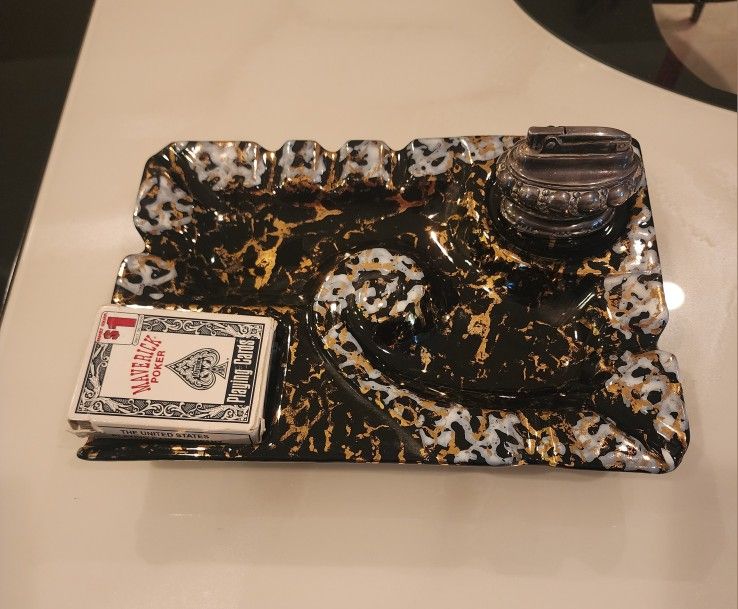 If you need to have an ashtray, you might as well have one that is stylish. Your box of cigarettes can sit in the compartment where the cards are. You could have a vintage lighter sitting on the other corner. This is a very large ashtray at 8 x 11.5 inches.