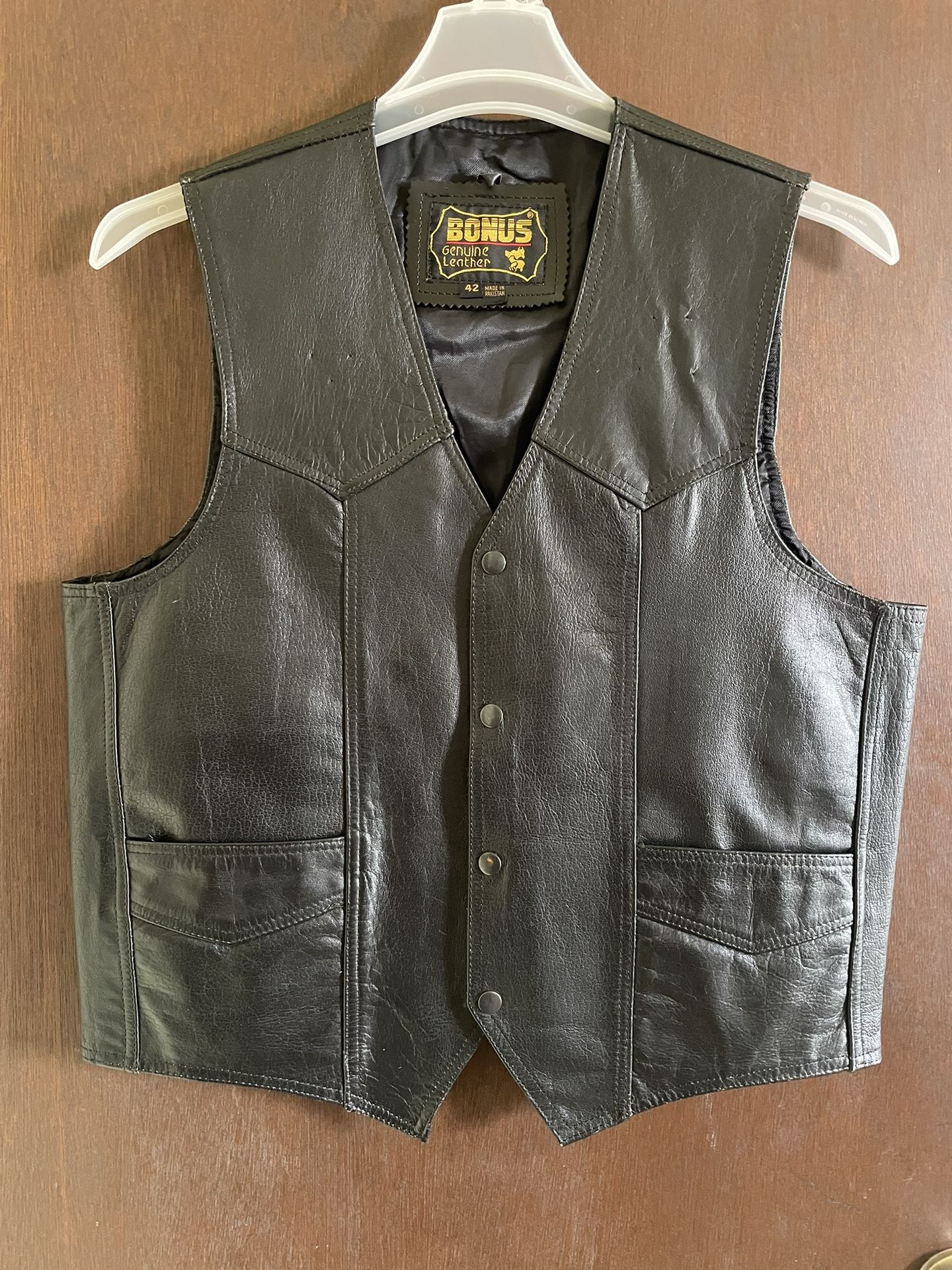 For sale, genuine, leather vest, size 42(medium, I think) condition is excellent, except few pin holes see the pictures. $35 and of course it don’t fit you,You don’t have to buy it. Thanks for looking.