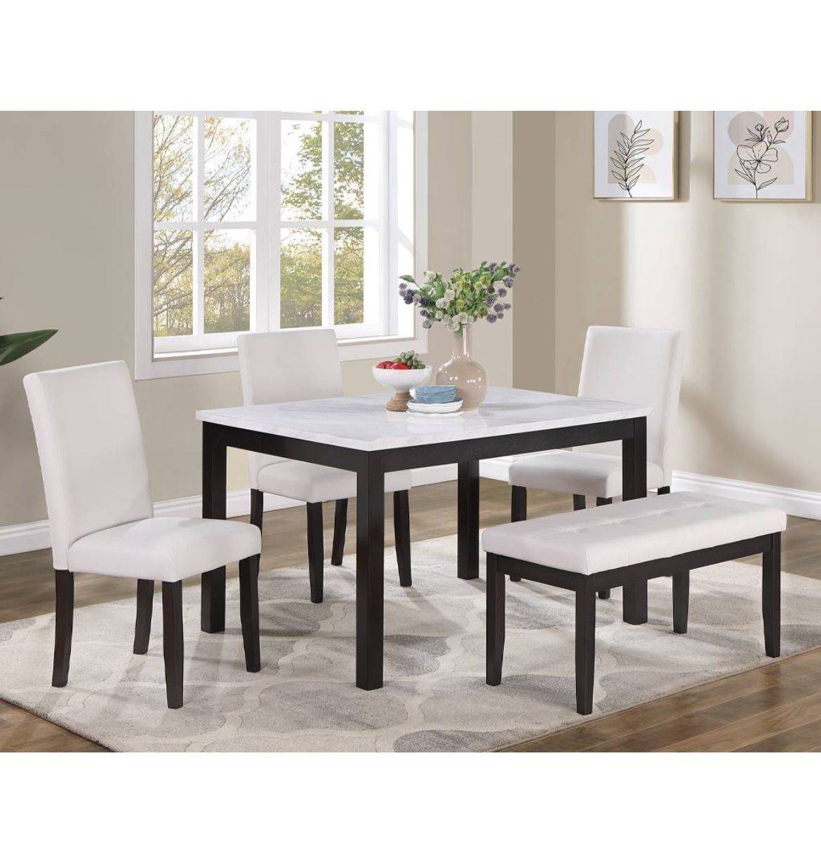 5 Piece Dining Set Standard Height White Faux Leather Seats 1 Bench Faux Marble Table Top Brand New In Box Firm Price $320
