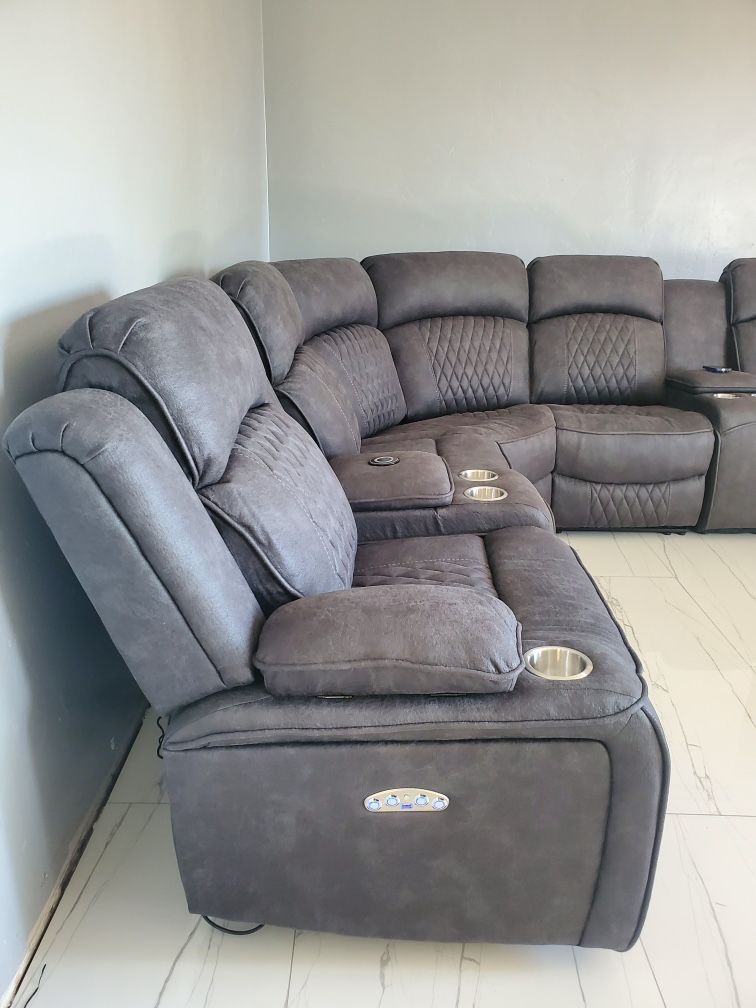 Power Reclining Sectional Dimensions: 99x99x39H Store price $2400 FURNITURE . BOSS Price $1499 Gel leatherette fabric 4 power recliners 4 power adjustable headrests 2 storage consoles Cup holders USB Wireless phone chargers *also available in brown leather* Please check out all my offers Everything Comes Brand New Delivery Available Ready to buy? Contact me direct 951-251-2983 Follow my Instagram @Furniture.Boss Thanks for reading my ad