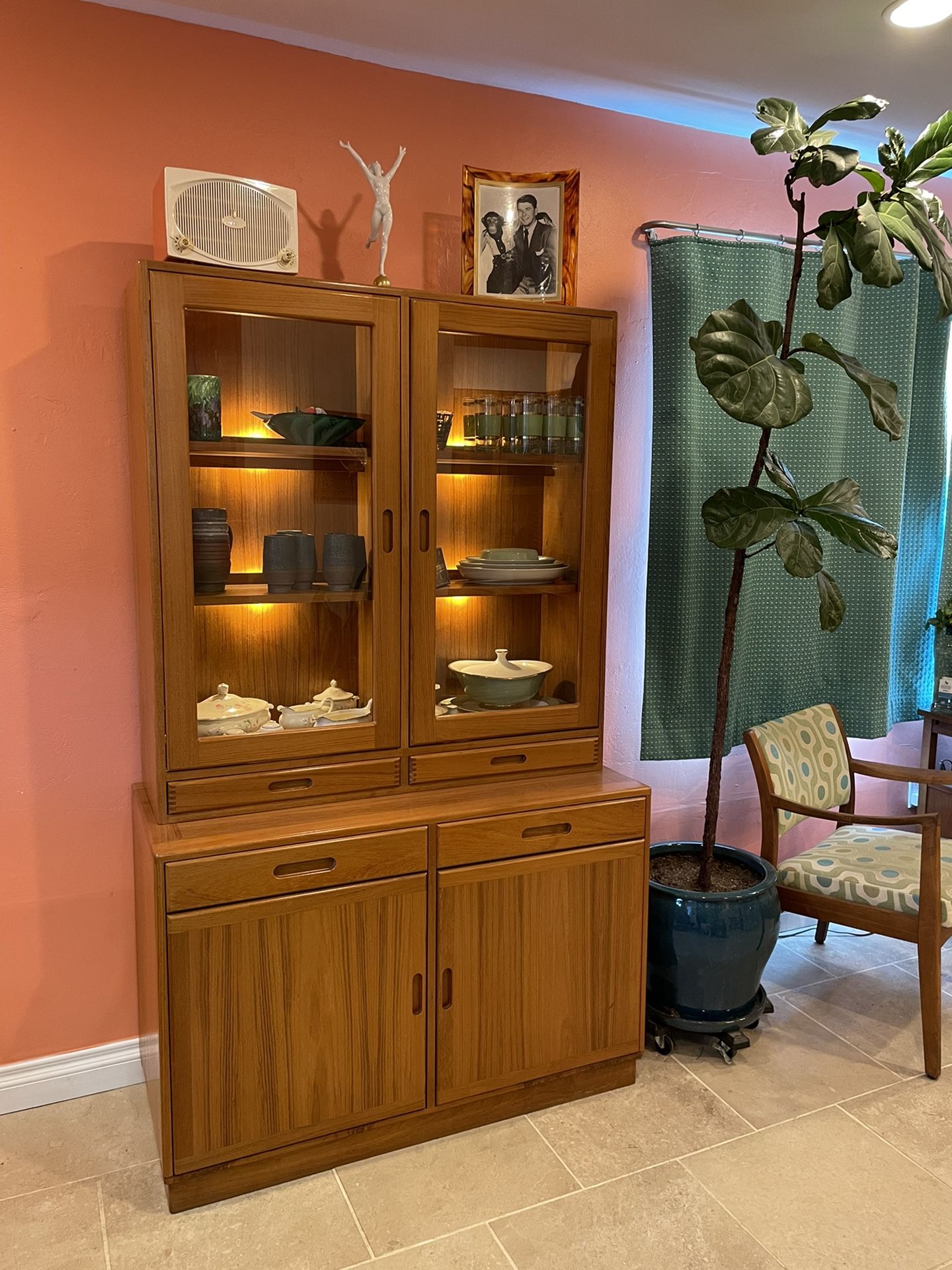 Solid Teak Hutch / Credenza Made In Denmark ONLY the hutch and credenza are for sale in this listing, none of the display items come with it, they are display only. This absolutely beautiful matching set (2 separate pieces) is in mint condition. Solid teak, no veneer and no particle board. Very heavy. This is the real deal vintage. Low profile but with huge amounts of storage (currently holding two sets of china + decorative items). Dovetail drawers, beautiful carved out handles. Shelving comes with a lighting kit to display your chins or decorative pieces. Light bulbs just upgraded to specialty LED bulbs. Credenza - 20” depth, 44.5” width, 30” height Hutch with glass doors - 13” depth, 44” height, 42” depth Overall height 74” Matches a teak nesting table set and teak dining room table + chairs that I also have listed - check out my other listings! Danish Denmark mid century modern design Vintage antique 1960 / 1950 $1,300