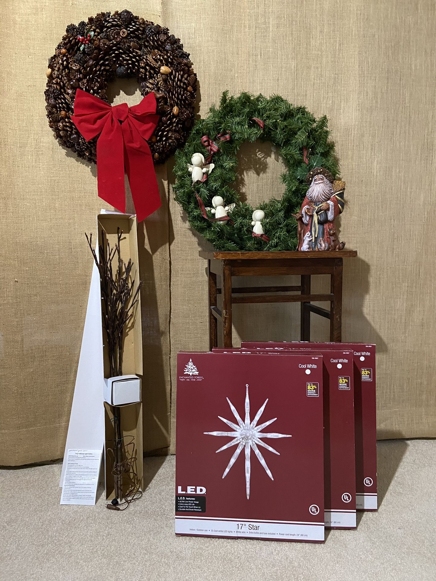 2 wreaths, 3 stars with lights (2 never used), lighted branches, and figurine.