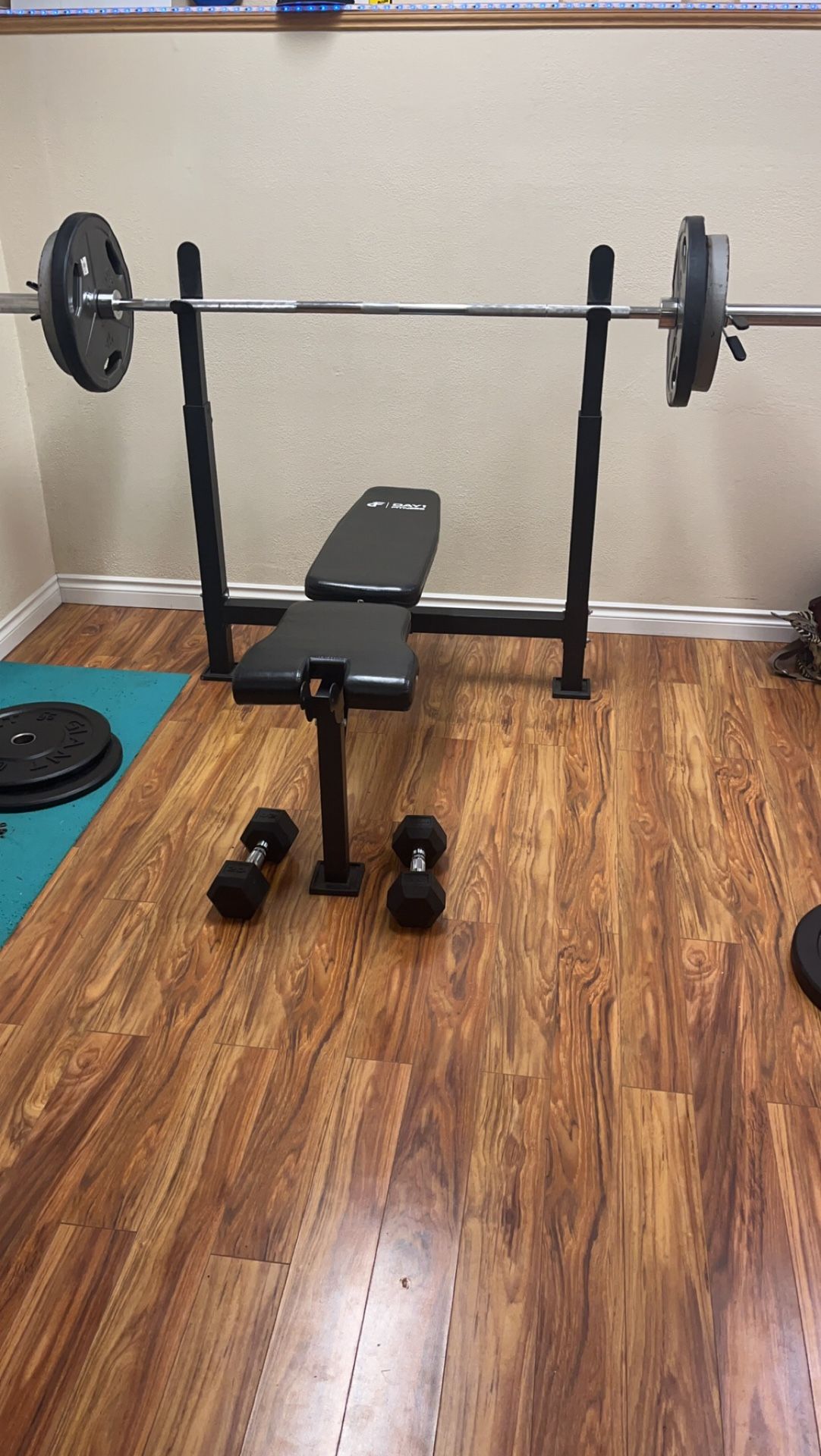 45 lb Olympic bar with bench and 315 lbs of weights and dumbbells included and leg extensions