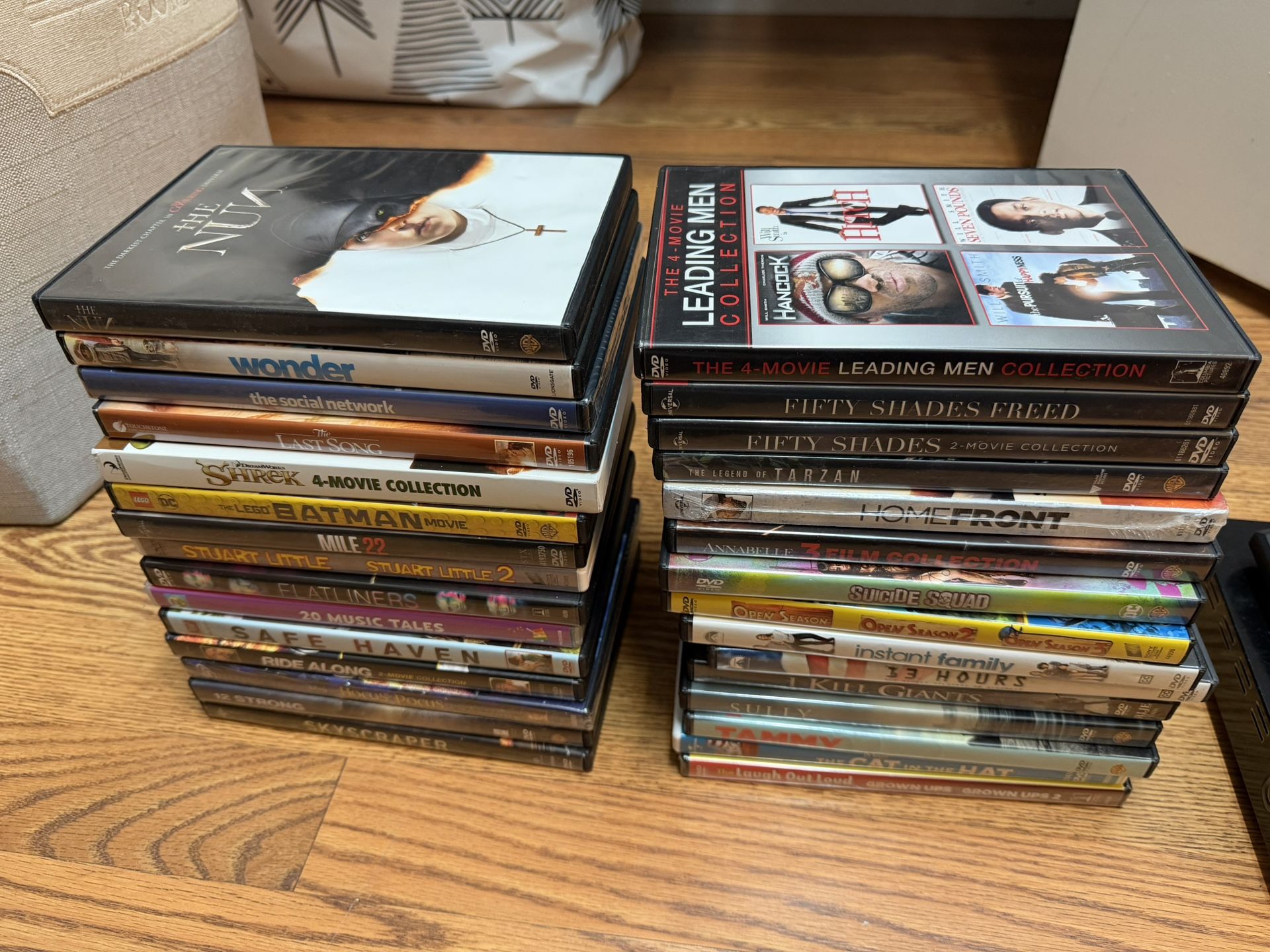 This is a collection of 30 dvd’s including DVD player Many of these movies are still brand new and never opened Asking $80