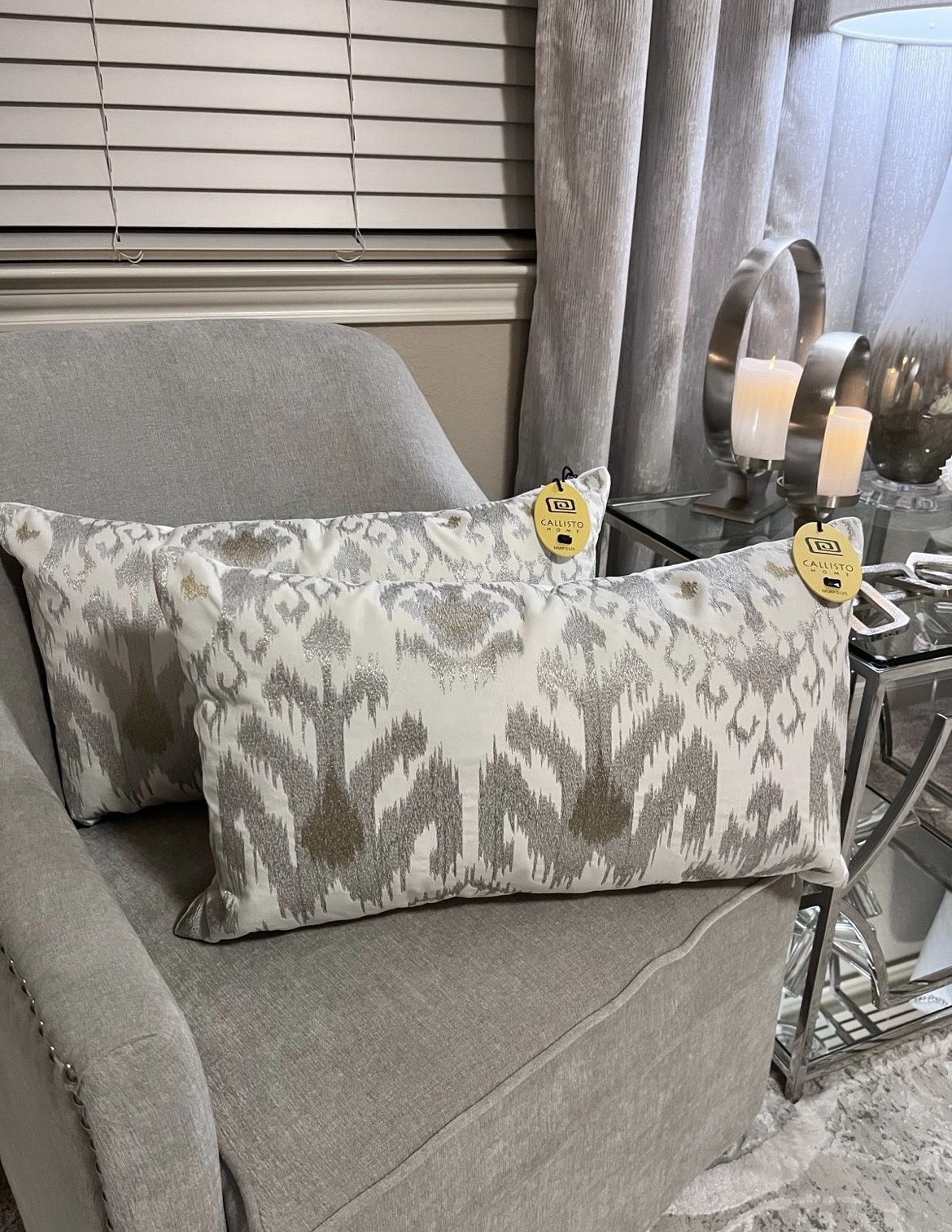 Also available in square size: 22"×22" BEAUTIFUL EMBROIDERED IKAT SHAPES GOLD AND SILVER STITCHING CREAM VELVET PILLOWS ONLY 2 AVAILABLE FOR PURCHASE WILL SHIP ASAP 2-CALLISTO HOME DECORATIVE PILLOWS. Callisto Ikat embroidered cream velvet with metallic silver pillow Color: Cream Velvet silver and gold embroidered finish metallic details Size: 14"×24" Style: T05032N11 Beautiful high end luxury pillows fill duck feathers down This pillow is so beautiful in person Zippered back Ship same day also available in 22"×22 square Please visit my page for more items Other accent pillows available to match and complete your home decor