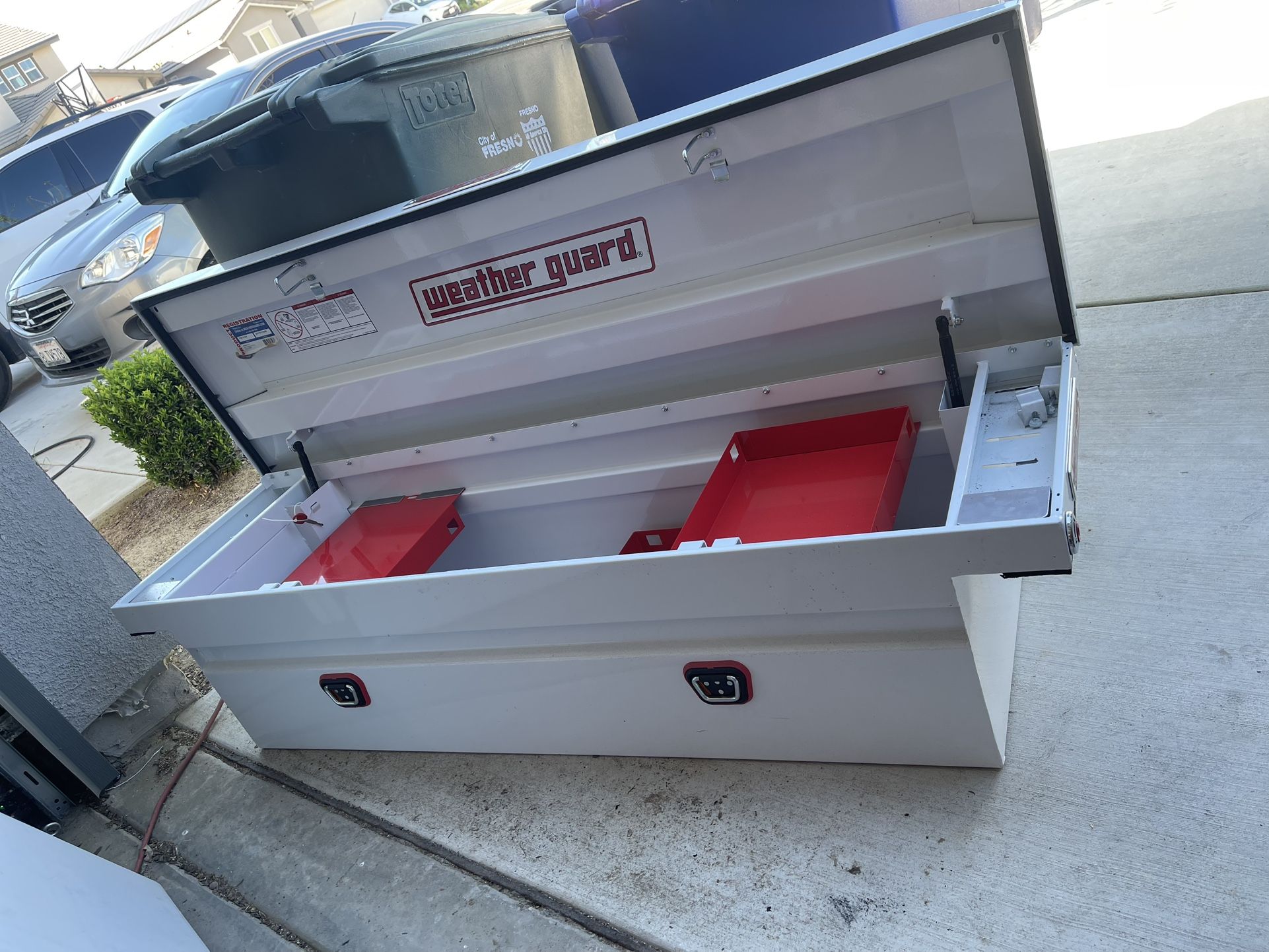 White Weather guard toolbox. Has 3 sliding trays and key for the lock. Brand new, never used.