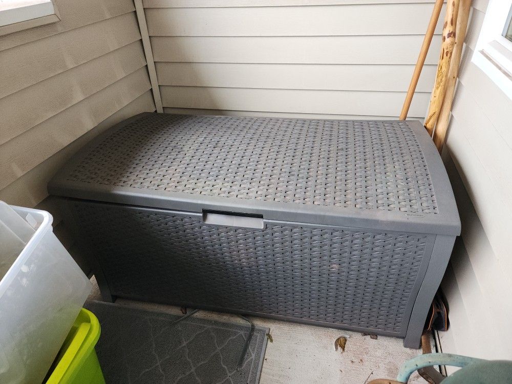 This bin has been great. Perfect for storing all of my camping gear. I've had it outdoors under a covered area for 3 years and none of my gear has even remotely been effected by the elements. It is thick plastic with great hydraulic hinges (lid stays open when lifted) and a strong latch to keep it closed. No damage, great condition, just some light dust on the top (if I had a water hose I'd clean the top, but I don't). "Suncast Outdoor Storage Box - 73 Gallon Mocha Brown Deck Box for Patio, Waterproof Outdoor Storage Bench, Resin Wicker Style, Heavy-Duty, Lockable Lid for Cushions, Shoes, Pool & Garden Gear" 51" wide 28" deep 25" tall It's big. I accept Venmo, PayPal or cold hard cash. Pick Up Only. I live near the Tacoma Mall. I am available most week nights between 5pm and 10pm or weekends all day. I am selling this because my car broke down and I need the money. I'm also downsizing to a smaller apartment and need the space. (still near the mall.) Please respect my time. I will communicate and follow through with serious buyers.