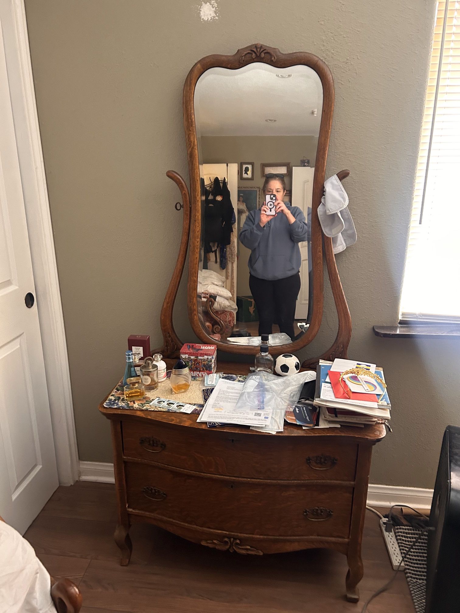 Beautiful, and well preserved antique dresser. Unique beveled mirror. Top drawer has a keyhole, but no key.