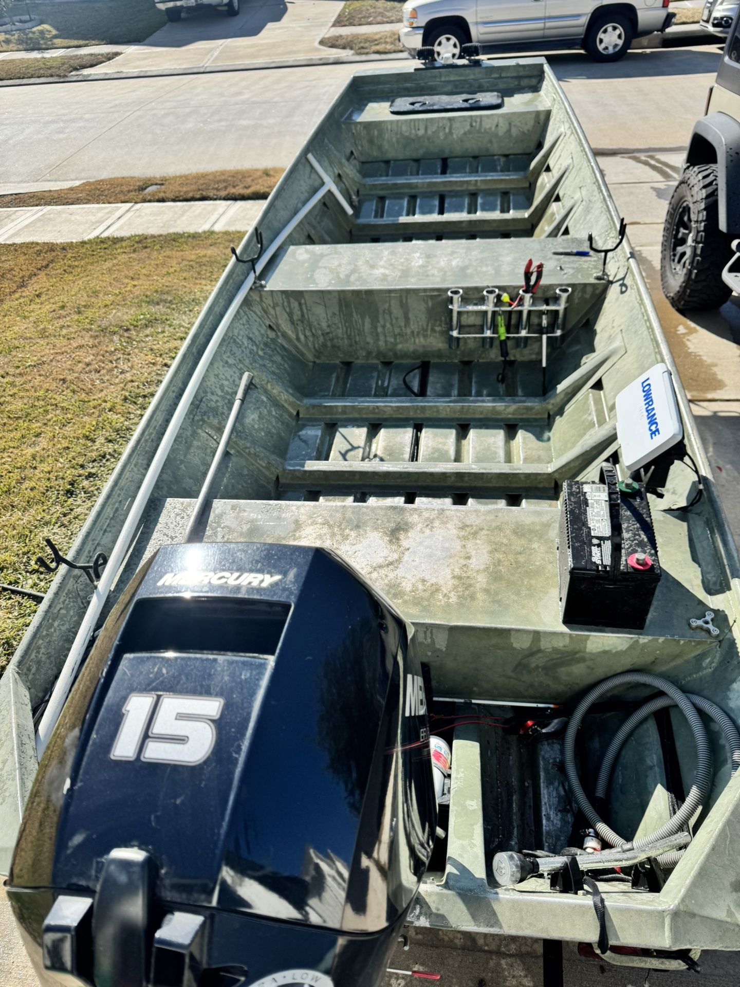 Mercury 15hp. Probably less then 30hrs. Lowrance hook7. 14ft weld craft. - welded. No rivets. 8lb claw anchor. Two storages. Transom saver. New bearings on trailer. Titles for boat and motor. Bill of sale for trailer.