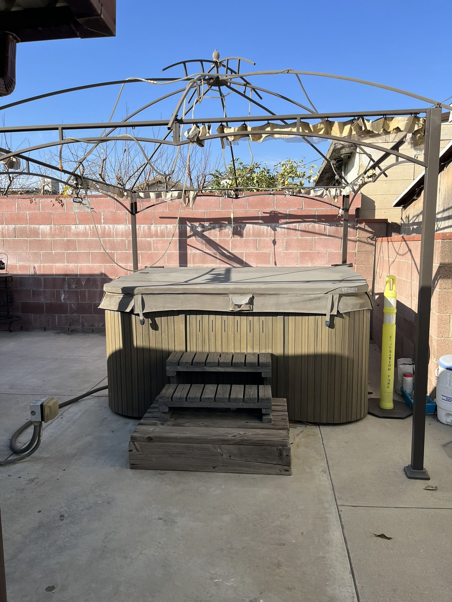 FREE hardwired hot tub and canopy frame Pick up for scrap or anything else Need gone asap