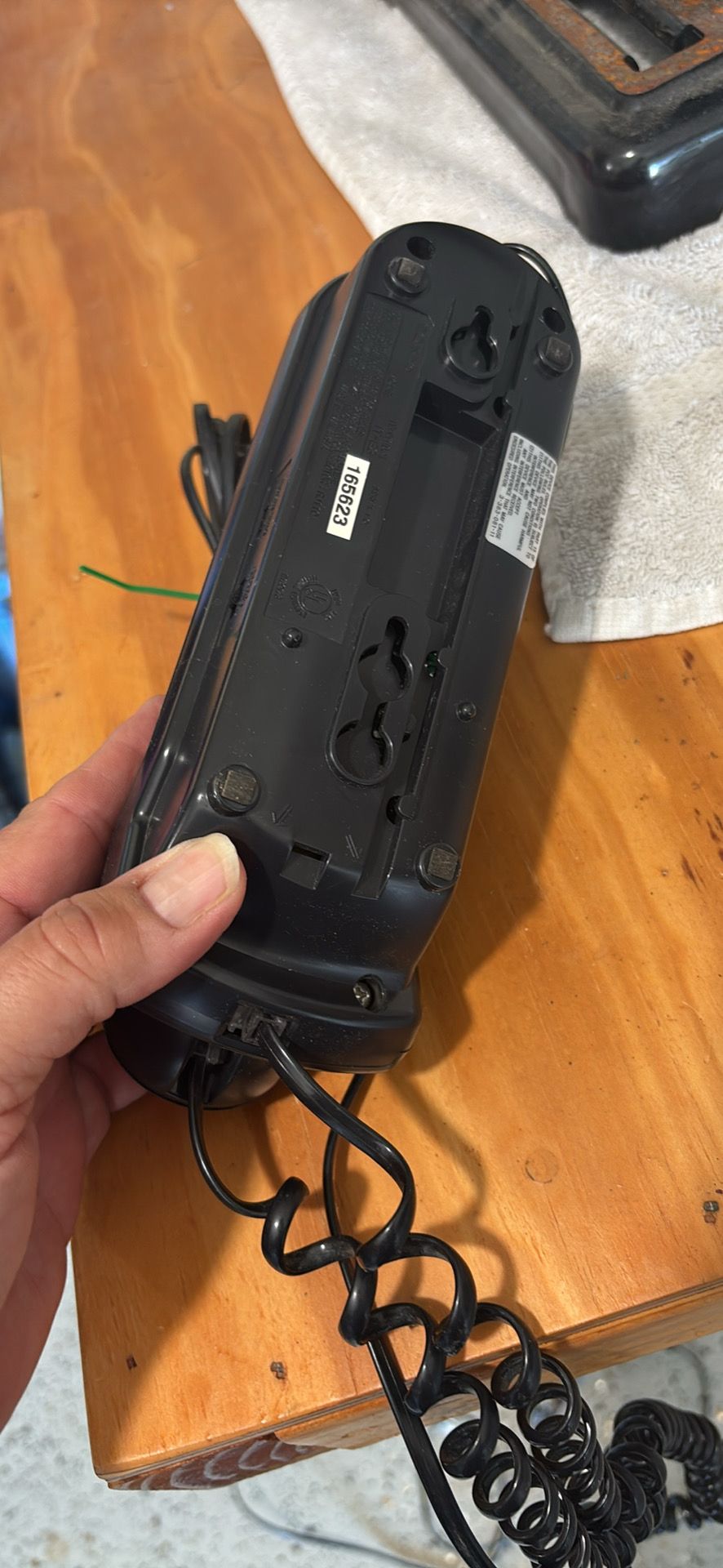 Black Sony landline phone with long cord. The phone can be hung on a wall or just sit on a table.
