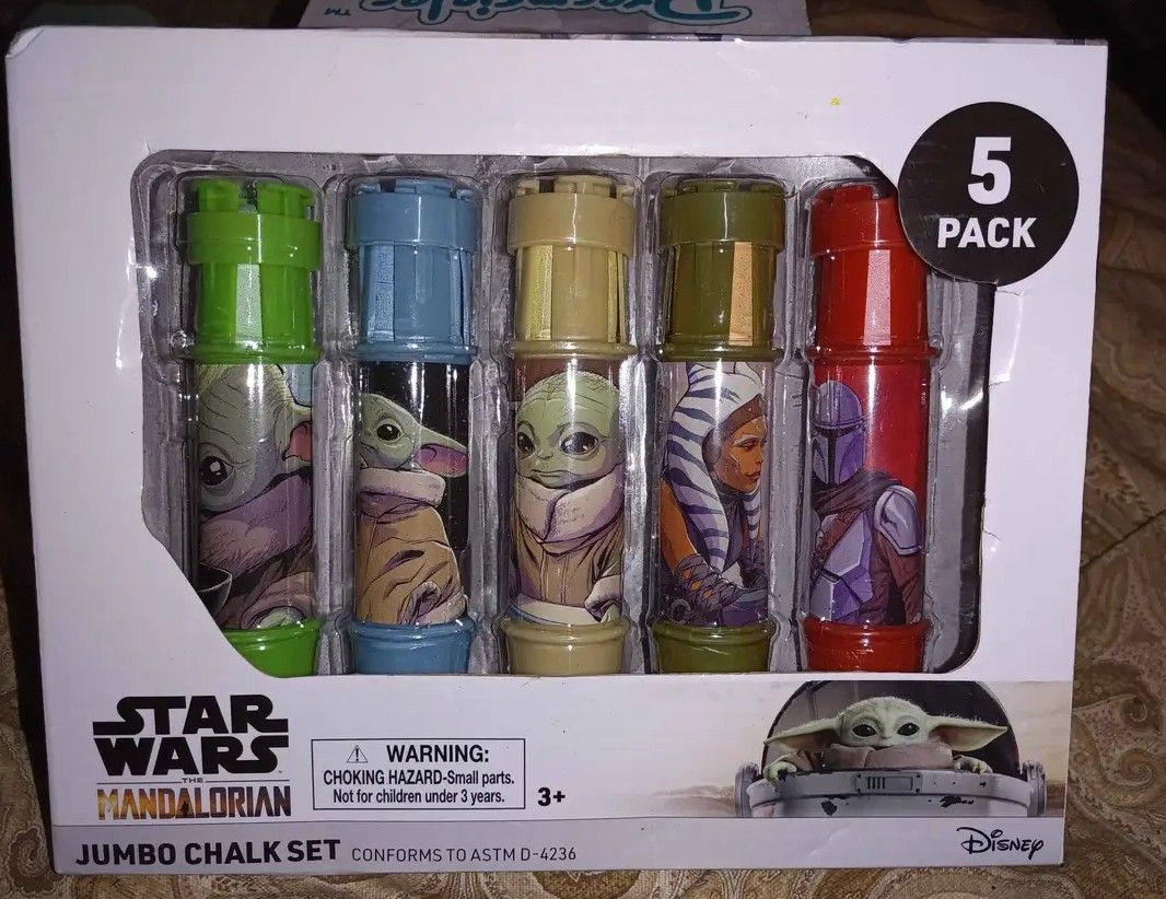 Perfect for any little star wars fan. Includes: 5 Refillable Jumbo Chalk Holders with Mandalorian Characters Safe, washable and easy to use for little hands. Would make a great birthday or christmas gift