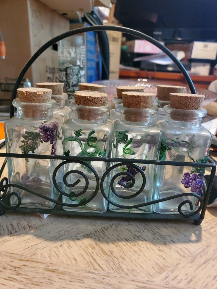 Vintage hand painted grape spice jars, no chips or anything. Corks still in good shape.