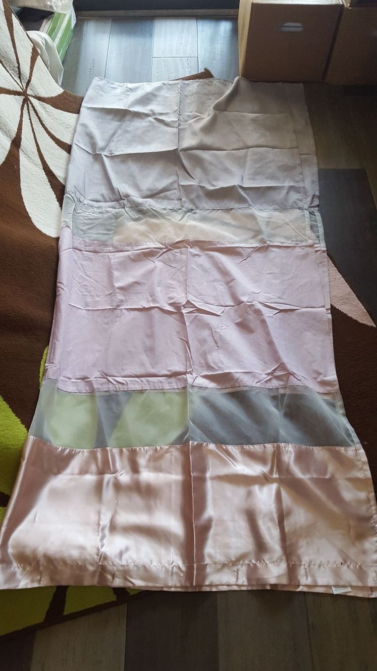 Excell standard size shower curtain. Silver/Platinum sheen, rose satin, white sheer & lilac colored. Specifications: 75% polyester/25% cotton Dimensions: 70" × 72" Machine washable. Gently used. In perfect condition. Smoke free & pet free home. Moved & no longer need a shower curtain.