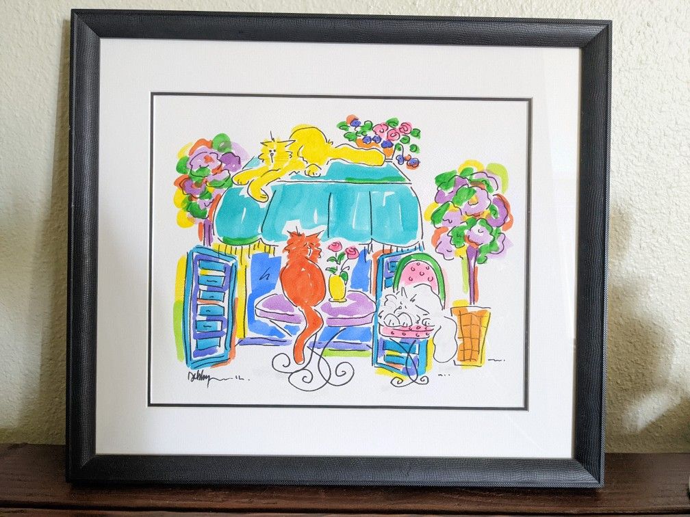Adorable framed watercolor with heavy black matte frame, double beveled mats and glass. Ready to hang. Quality piece.