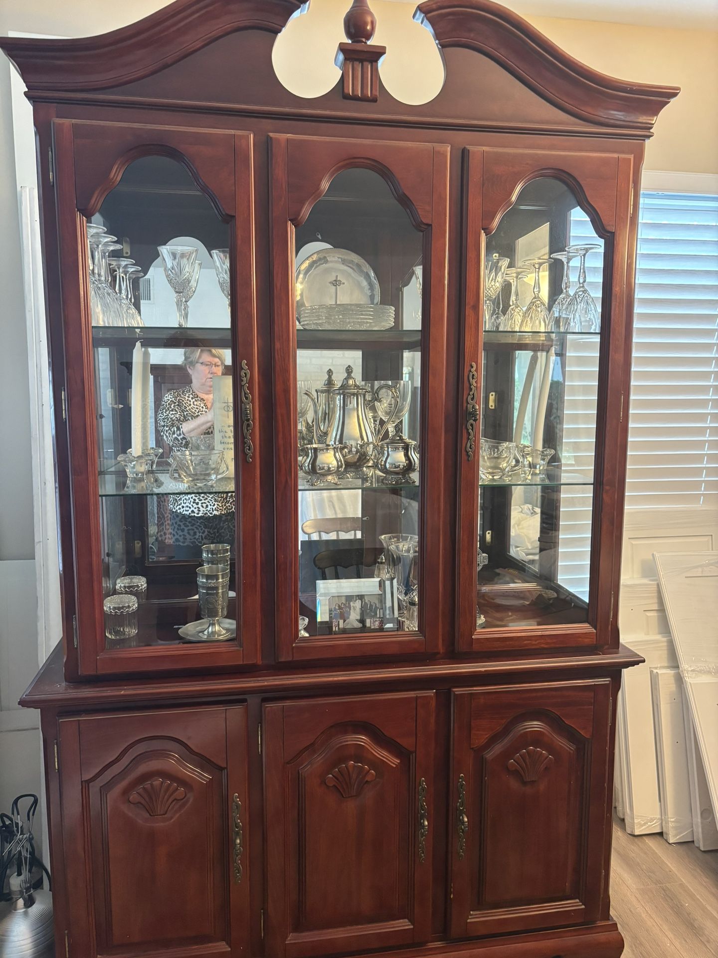 Hutch with glass shelves, mirrored back and inner lighting. Your dishes and special items will be beautifully displayed here. 52” high X 46” wide X 15” deep Dining Cabinet with antique gold hardware, 3 doors and one shelf for additional storage. 31” high X 50” wide X 17” deep