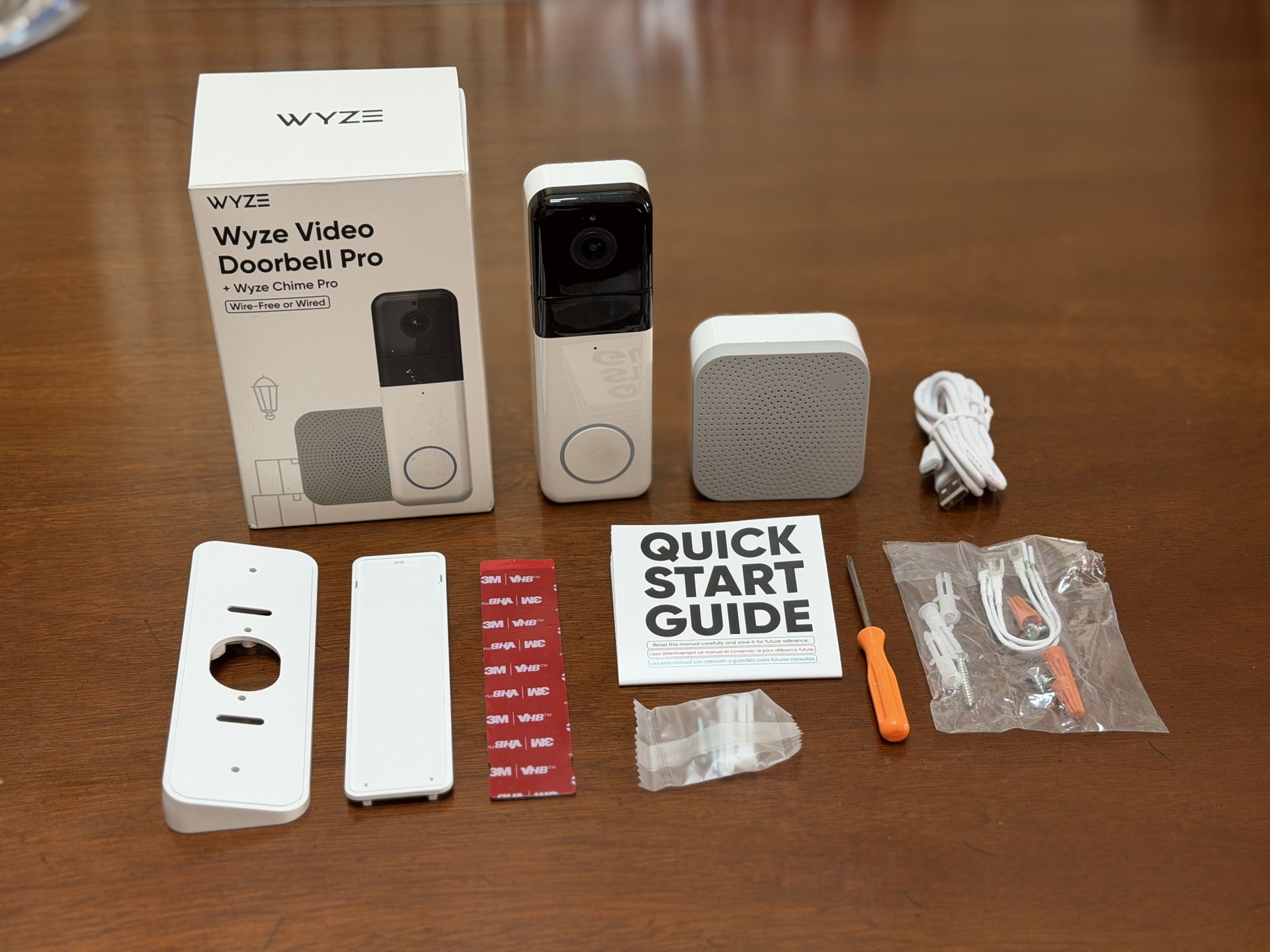 Wyze video doorbell (pro) & chime (pro) - Wired or battery operation - Installation guide - Mounting kit - USB charging cable - Back plate & adhesive - T7 screwdriver - Screws/hardware - Extension wires Works great! Model WWDPC, comes in original packaging.