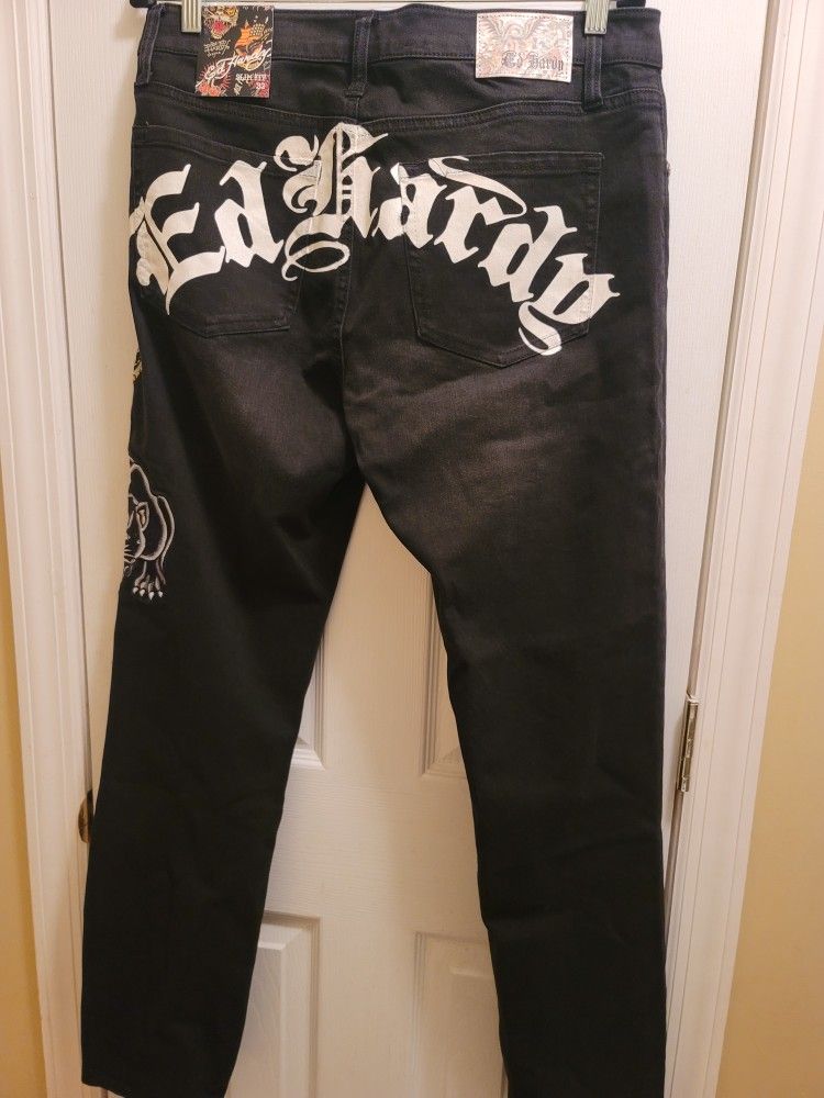Elevate your style with these black Ed Hardy slim jeans featuring embroidered skull and snake designs. The 5-pocket design and mid-rise waist offer both functionality and comfort, while the tapered fit and stretch material provide a slimming effect. These jeans are made with a blend of polyester, spandex, cotton, and other fibers and can be machine washed for easy care. The zipper and button closure ensure a secure fit. Perfect for any season, these jeans are a great addition to any wardrobe. Smoke and pet free home. ships next day. If you love Ed Hardy, you will definitely have to add this cool jeans to your collection! **Let me know the size you want. This is a Bundle of boxers and jeans!