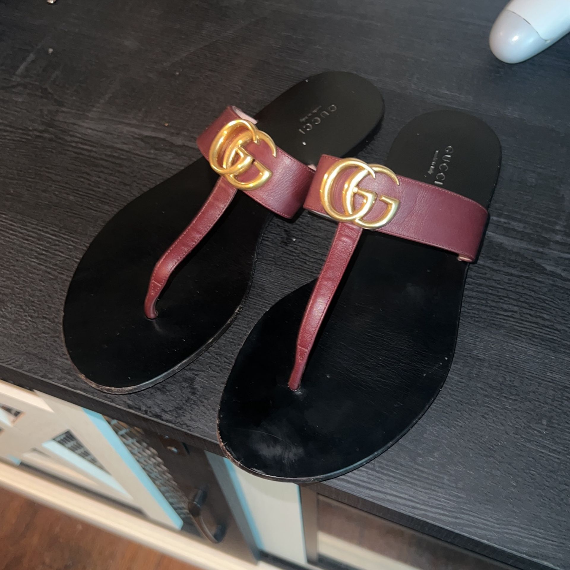 Gucci Bordeaux Red GG Marmont Thong Sandals 8 1/2
