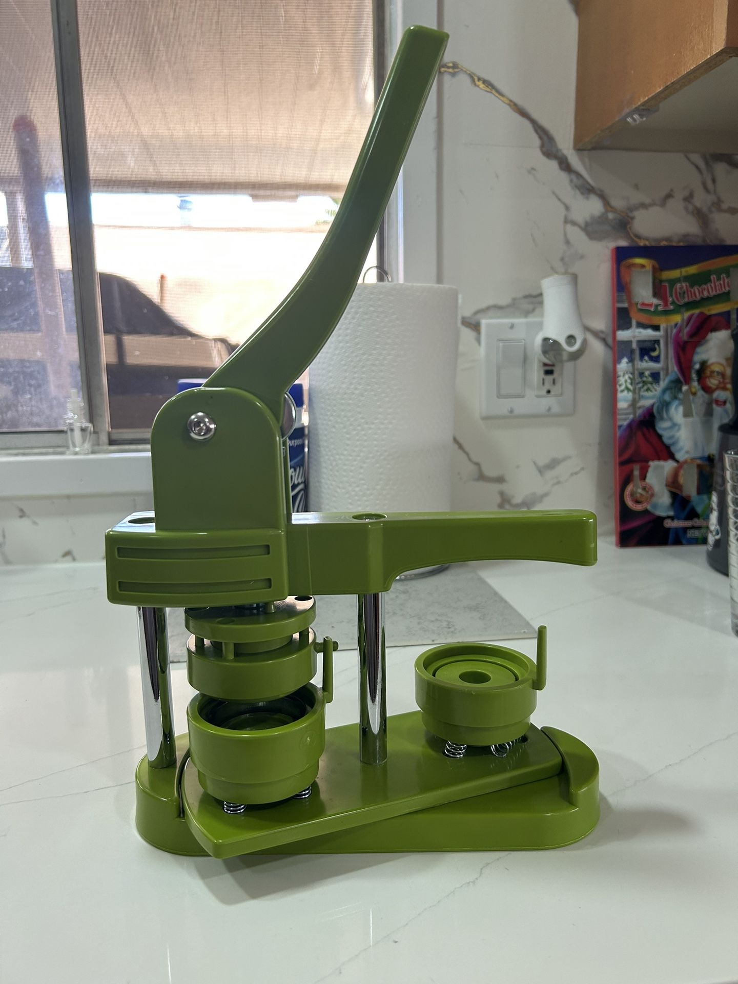Out of box button maker.. bought for a project and never used.. makes buttons and magnets. No accessories just the button maker with 58mm plates