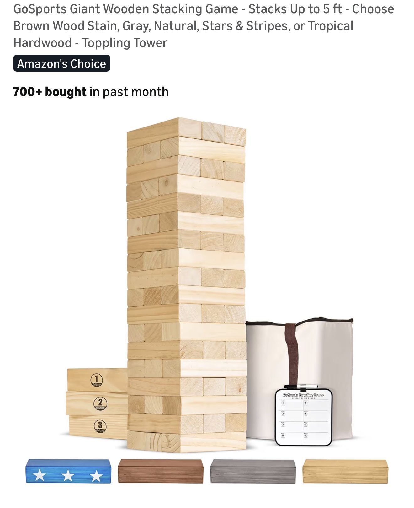 I paid over $100 for this :: brand new :: yours for a DEAL! GIANT SIZE: Tower starts at 2.5 ft tall and grows to over 5 ft during play - Includes 54 Giant Blocks (18 rows); Each block measures 7.75 x 1.5 x 2.5 inches DRY ERASE BOARD: Includes dry erase board to make your own optional party rules, goofy rules, adult themed rules, and more PREMIUM QUALITY: Hand selected knot free pine blocks CARRYING CASE: Includes robust canvas carrying case for easy portability and storage of blocks and accessories CLASSIC GAMEPLAY: Pull blocks out of the body of the tower and replace them at the top without the tower falling over