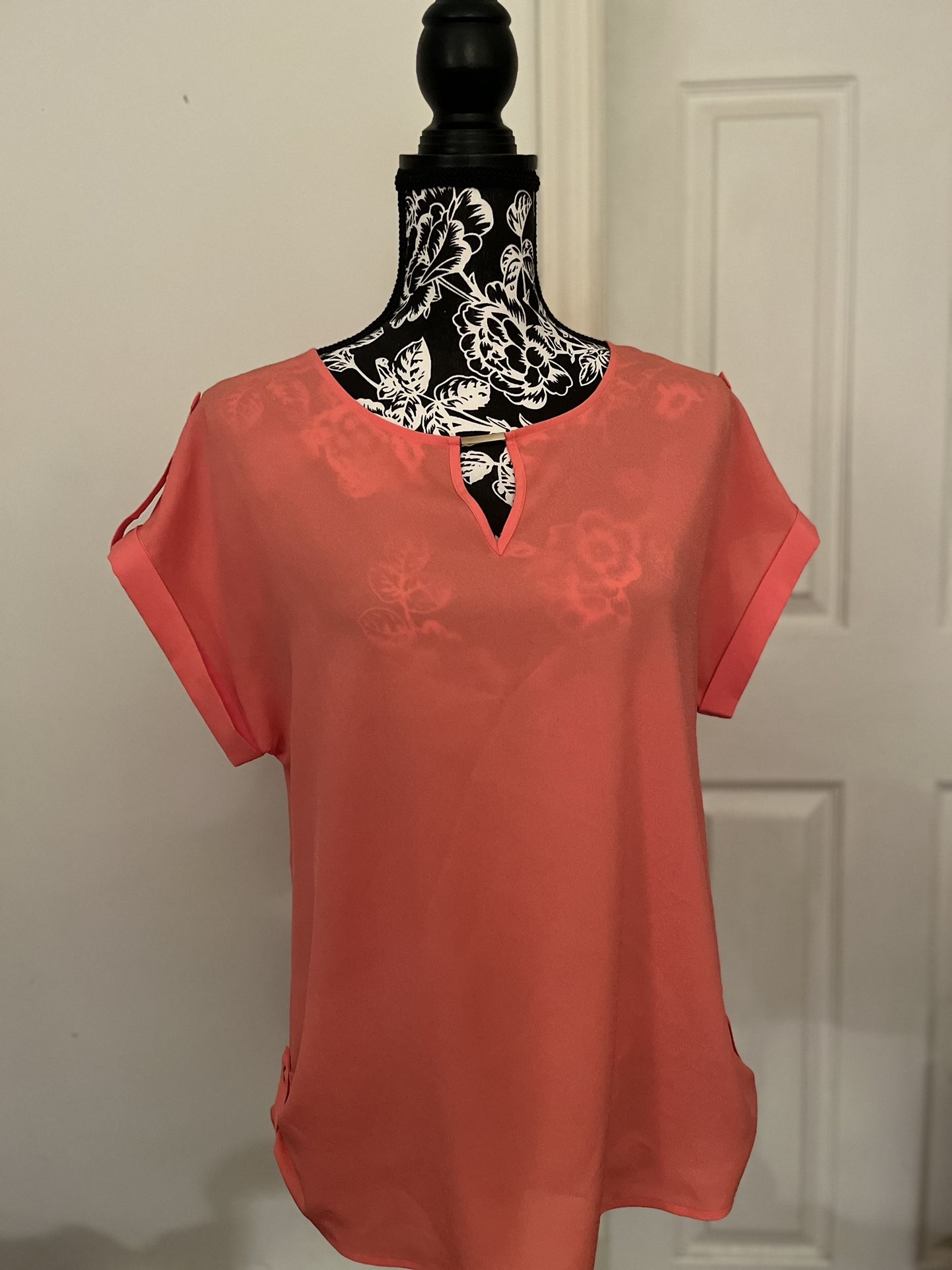 Calvin Klein Blouse Size Medium New With Defect. Please See Last Two Pictures. One small defect in the border line and the other one the hanger laces have been cut. Melon color, comes from a smoke free environment.