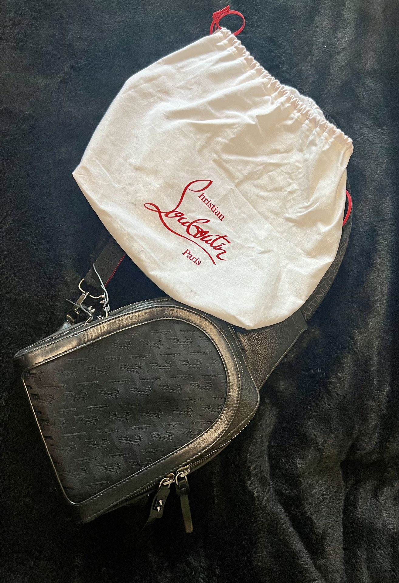 Christian Louboutin Black Loubifunk Backpack/Crossbody. In new used condition , my husband doesn’t reach for it as much anymore. 100% authentic. Comes with dust bag. Some stains inside pockets that can definitely be cleaned from normal wear.