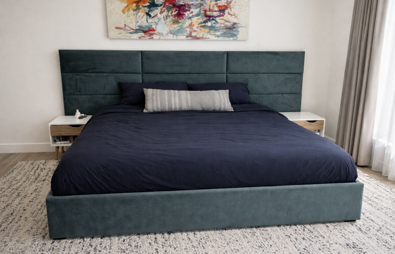 Beautiful upholstered bed frame with matching paneled headboard in deep teal/blue velvet (suede-style fabric). Includes mattress. Contemporary, statement-piece design with clean lines and solid platform base. ✔️ Upholstered platform frame ✔️ Modern paneled headboard ✔️ Mattress included ✔️ Very clean, well maintained ✔️ No stains or damage