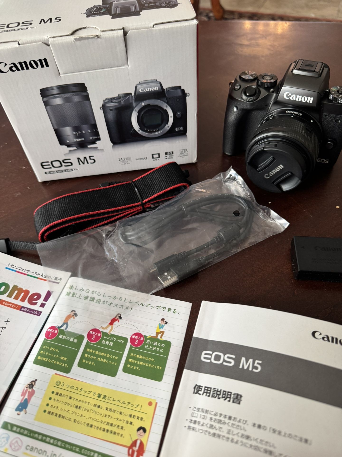 Made in Japan All booklets and pamphlets inside are in japanese Comes with: -EOS M5 camera -Canon 15-45mm lens -2 batteries (one genuine one 3rd party) -2 battery charging docks (one genuine one 3rd party) -box -carrying shoulder strap -Japanese booklets -lens cover 400 OBO
