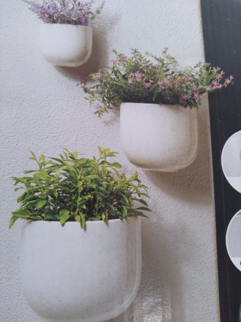 3 Wall Planters descending in size. Beige Ceramic Planters with drain holes and plugs. Great for indoor and outdoor use, real🌱 or decorative plants 💐. Hardware included. Small: 4"W x 3.5"D x 3.5"H Med: 6"W x 5.5"D x 5" H Large: 8"W x 7"D x 7"H