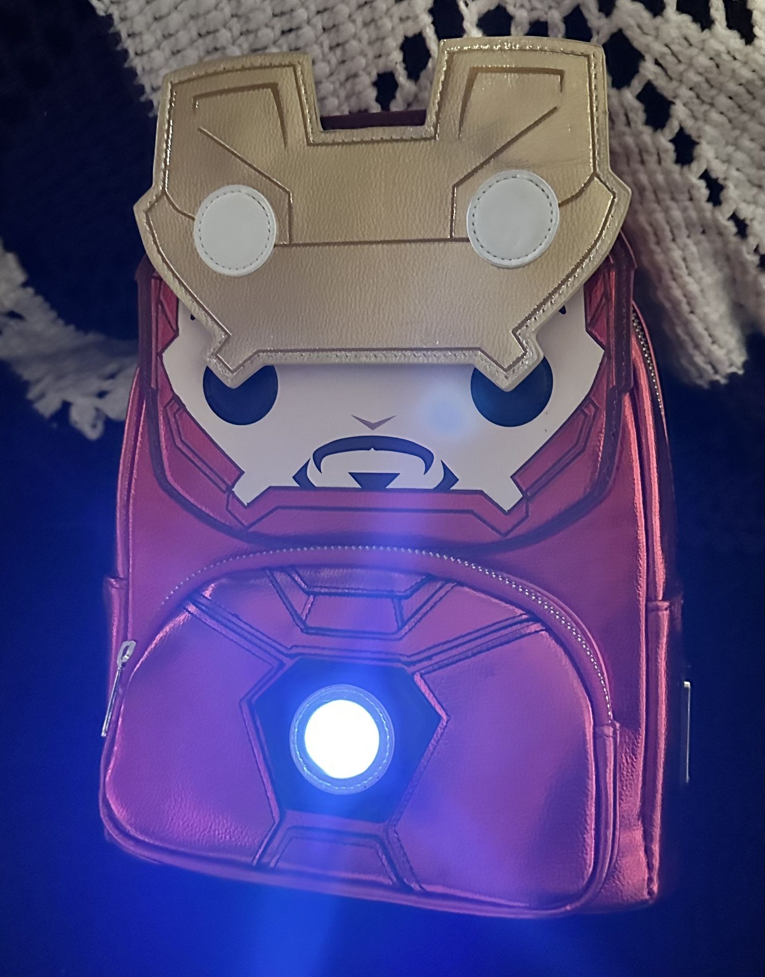 Brand New , with tags ! Iron man backpack with helmet lifting up ! Bottom pocket pouch lights up the arc reactor ! Was stored in a plastic storage bin, has a few dents due to other backpacks being on top of it. (Ex. 5th picture) Please look at each photo for all details .