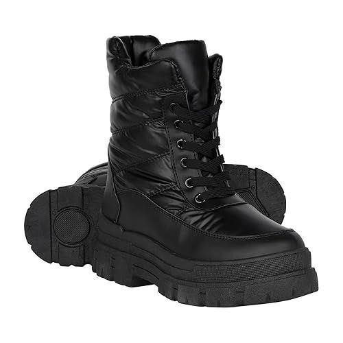 Chunky black winter boots for women. Has a cool platform sole and lace-up front. Upper part is a padded, quilted material for warmth. Non-slip sole is good for snow and wet surfaces. Size 7.