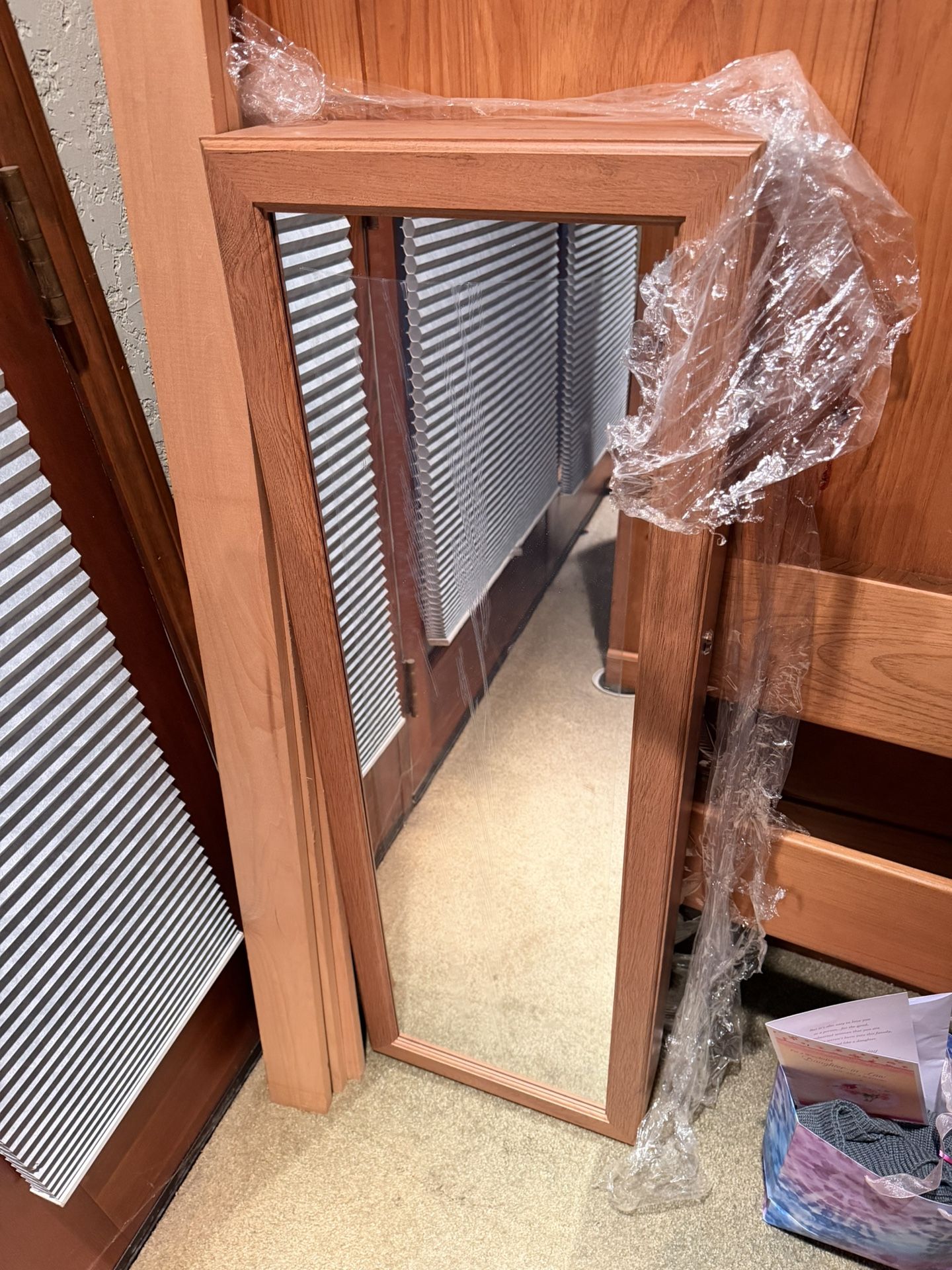 Brand new jewelry cabinet with full-length mirror. The protective plastic is still on the mirror. I only removed the plastic from the wood to take clear photos. Features: • Lockable with key • LED lighted mirror • Wall mount or door mount • Multiple storage sections for necklaces, rings, earrings, bracelets, makeup, and accessories • 2 drawers and built-in cosmetic tray • Rustic brown finish Approximate dimensions: 42.5” H x 14.5” W x 4.5” D