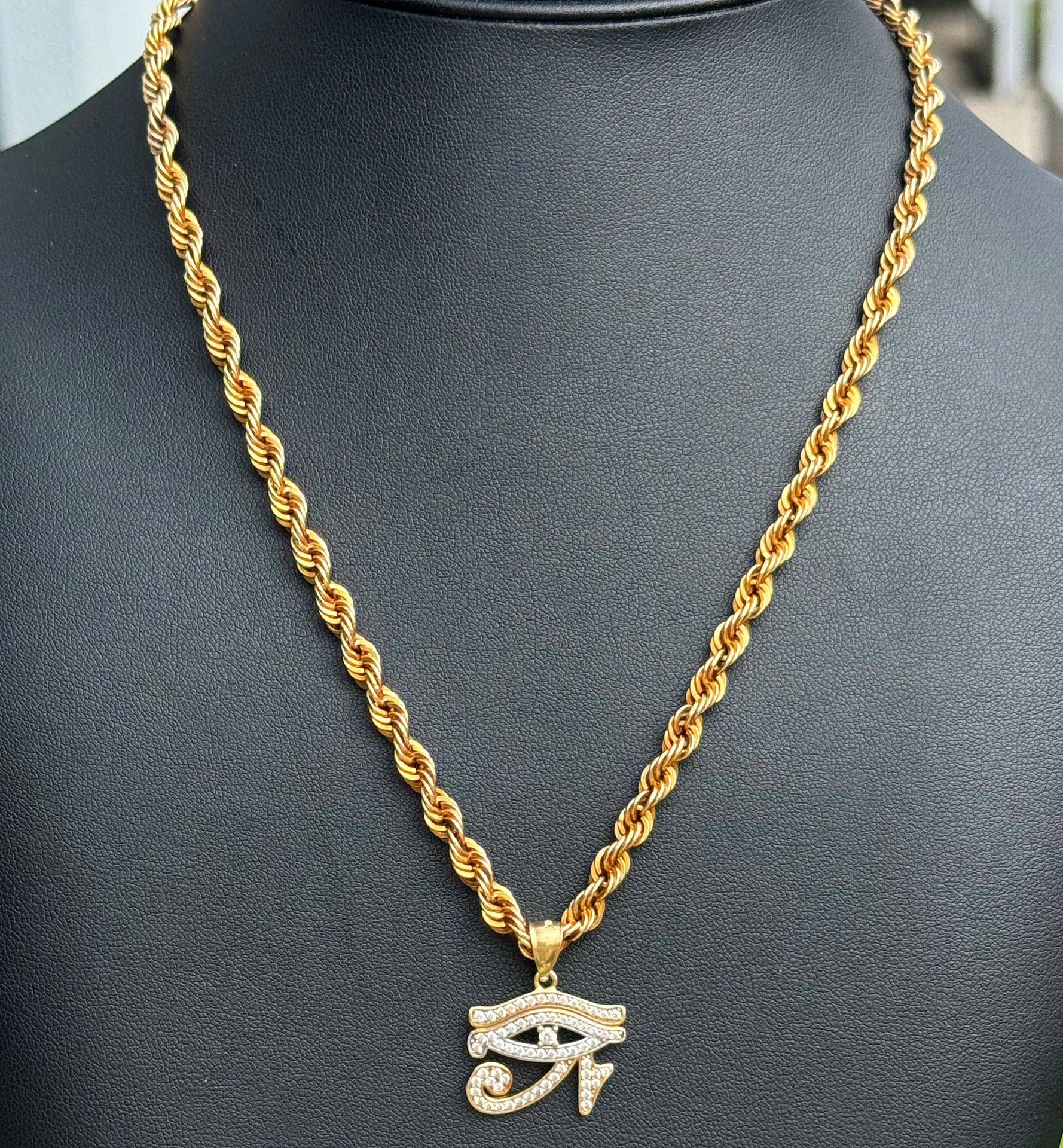 Gorgeous hollow rope chain with beautiful Egyptian Eye ποΈ of Horus pendant necklace made of 10k yellow gold, width: 4.50mm, length: 22.00 inches, total weight: 11.60grams. π€ππ€ The total carat weight of the white CZ stones is approximately 0.70CTW. The best choice for you! Perfect gifts ππ We buy Rolex and Audemars, patek . Do layaway in VIP SHOP Coral Springs π₯ππΈ We buy gold, diamonds, silver, coins π₯³π₯