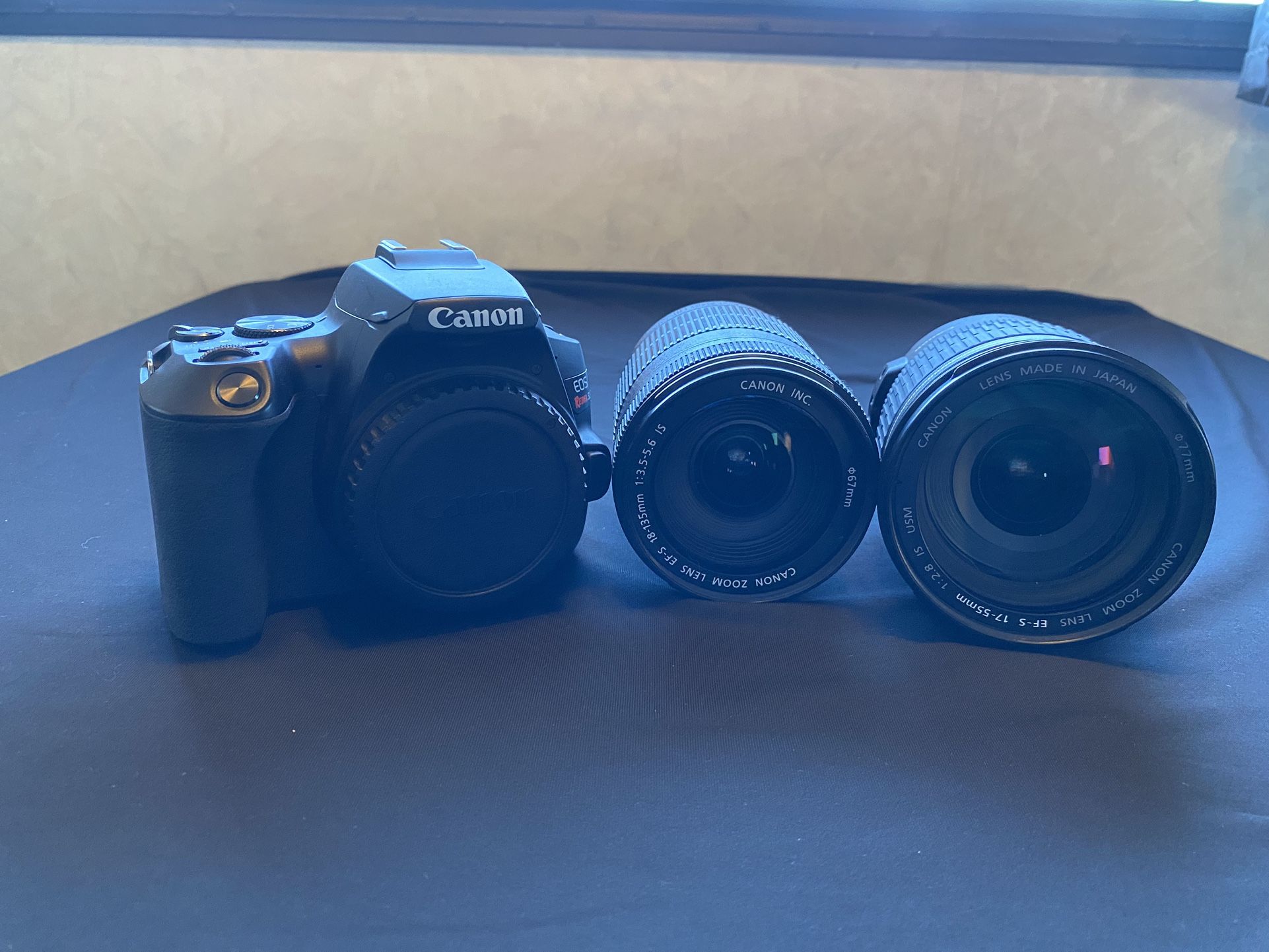 Cannon EOS Rebel SL3 Digital Video/Camera 4K $700 OBO comes with…. 2 lenses (2nd lens is worth $1500 by itself) 1 light 1 microphone 1 charger 1 battery creative lens filters cleaning kit 1 camera bag Works great! Upgraded our equipment… great for starters. Se Habla Español