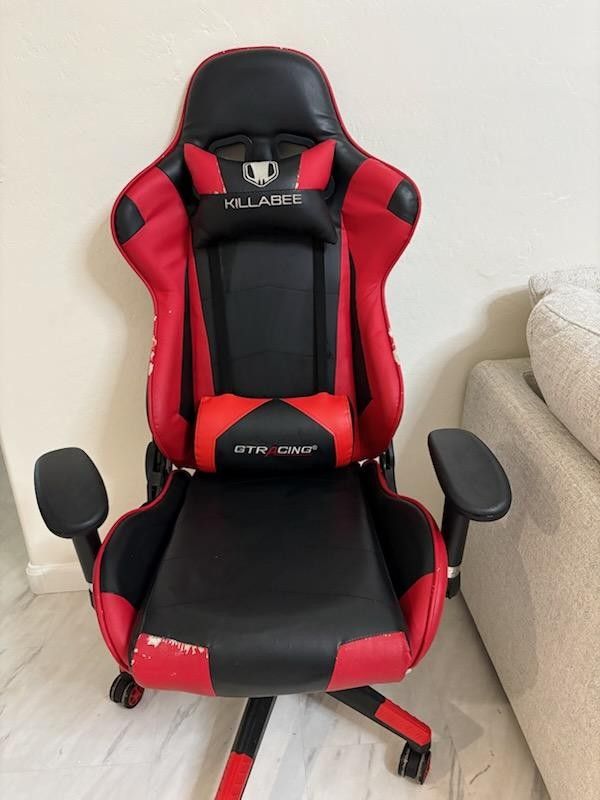 Red and black GTRACING gaming chair featuring an ergonomic racing-style design, adjustable height and armrests, plus lumbar and neck pillows—great for gaming or office use.