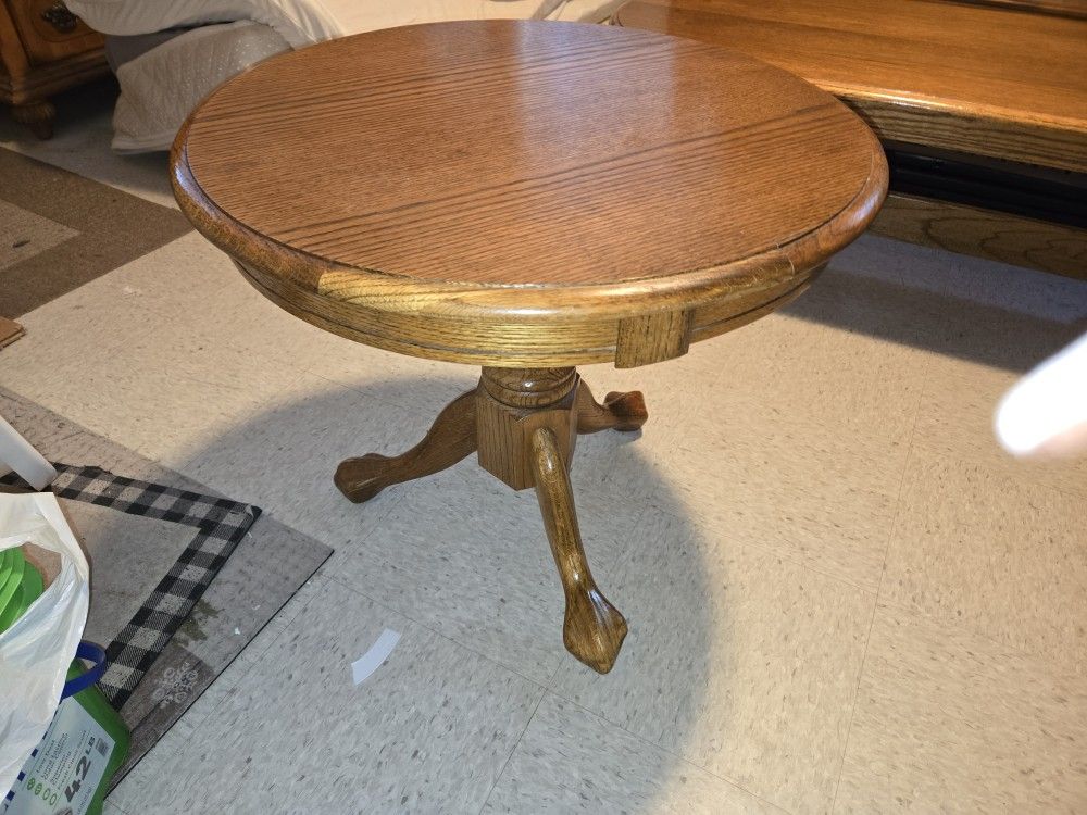 Round oak claw feet side table 24" Round 21"high $40 Oval oak claw feet end table 24"×54" 16" high. $50. BOTH for $75 Pick up on Picture Rocks Rd and Sandario rd area Tucson 85743.