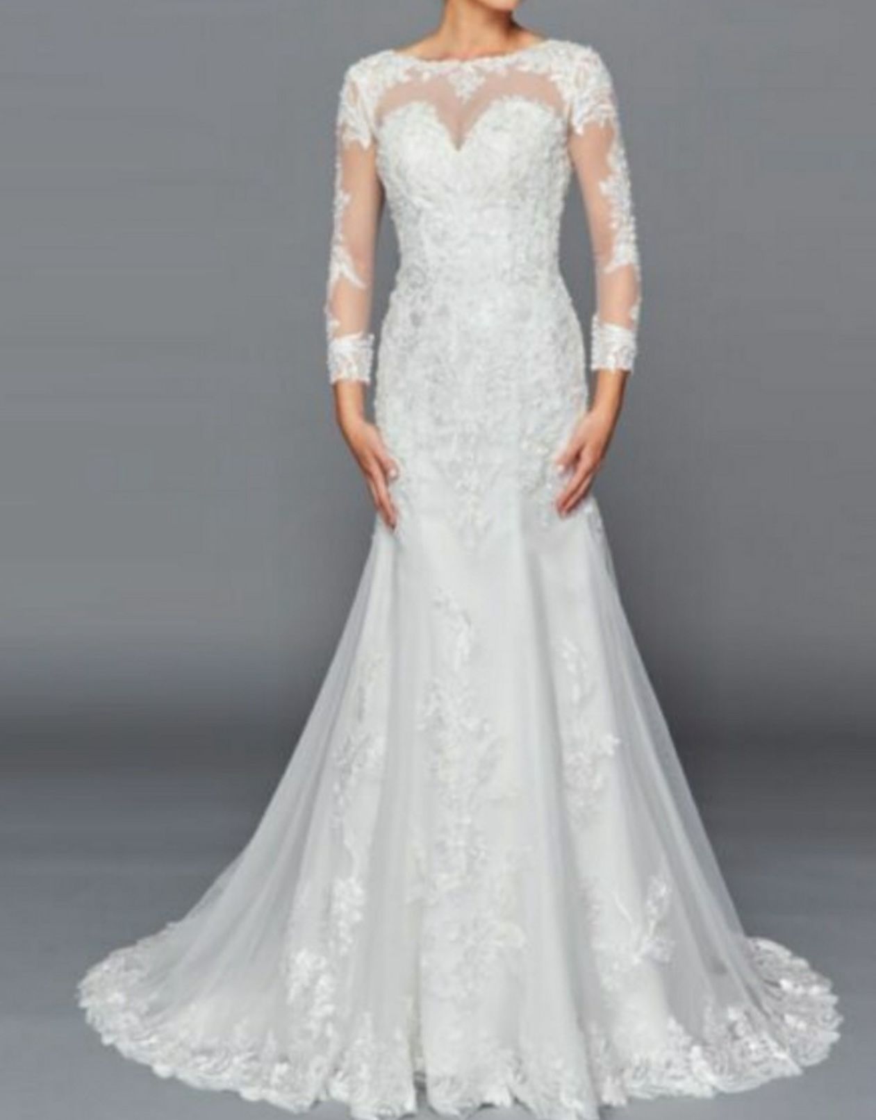 Like new Long sleeves Plus size but beautiful dress very sexy Never been altered Clean Was used for 1hr for a photo shoot
