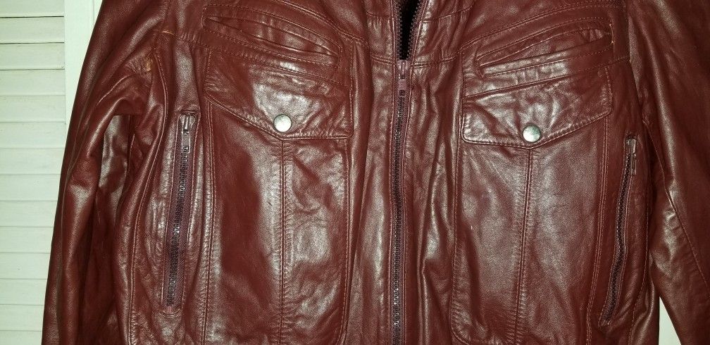 BERMAN'S MEN'S FINE 100% LEATHER JACKET COAT BURGUNDY DK BROWN w/ ZIP OUT LINING SIZE 46 EUC LIKE NEW 6 OUTER FRONT POCKETS 2 INSIDE POCKETS