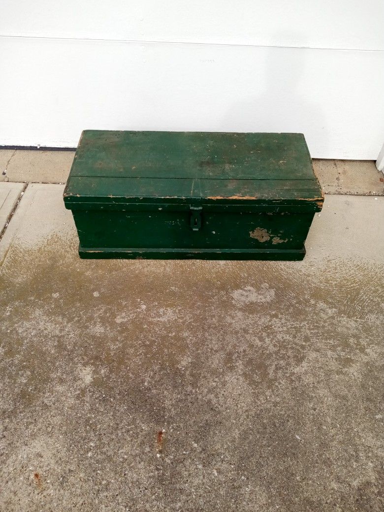 A vintage woodworker's tool box with handles and tray insert. Measures about 35" x 13" x 16 with the interior dimensions being a couple inches smaller all around. The interior paint is green with some flaking and the interior has a grey and brown color.
