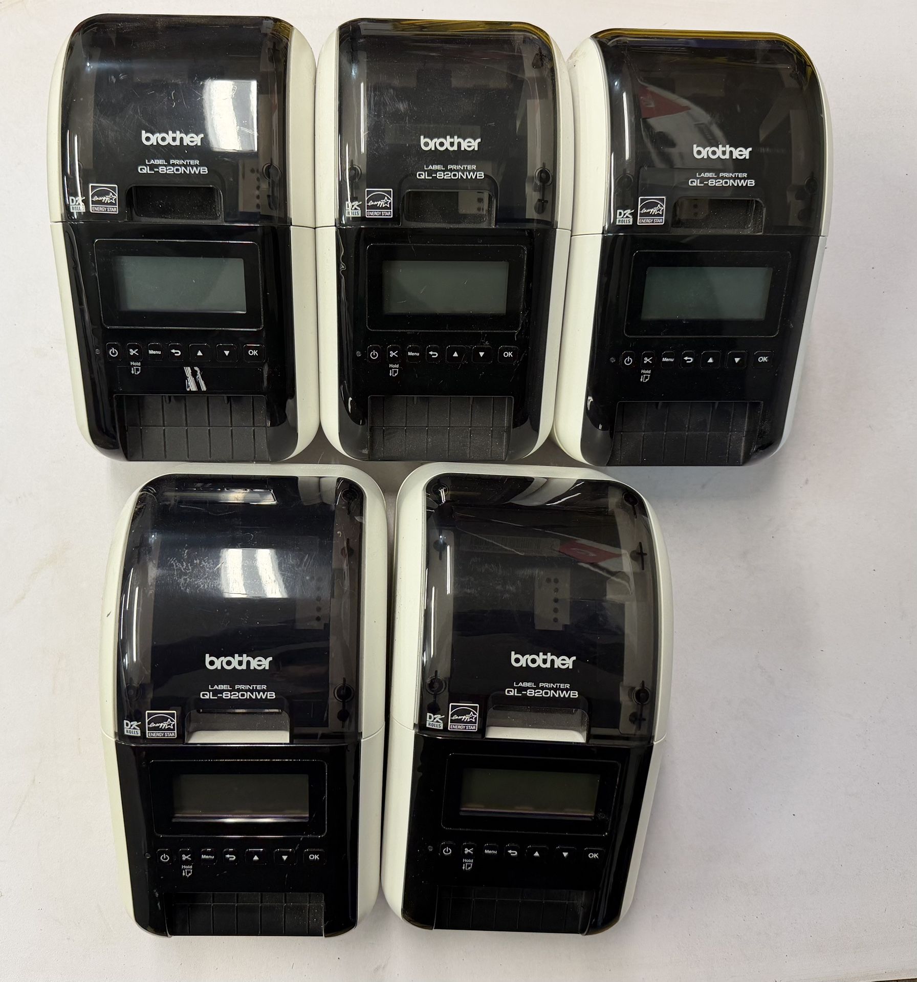 Quantity 5 5 power cables, no labels included. Brother label printers, model: QL-820NWB Printers go for $200 a piece new.